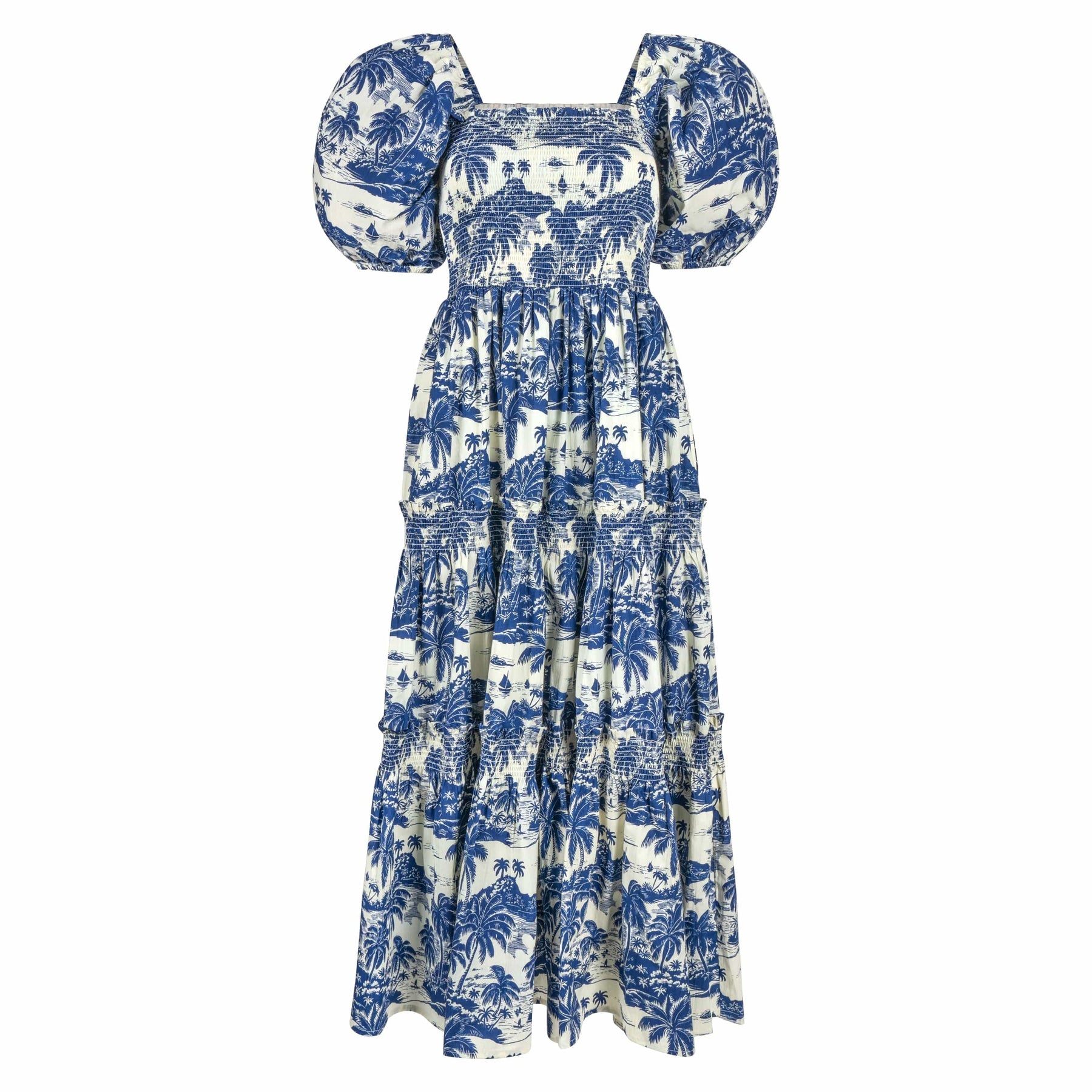 The Tropical Toile Tula Dress features a stunning navy and white palm print with a smocked bodice and tiered silhouette for a flattering fit. Designed with puff sleeves, this dress is perfect for both casual beach days and elevated summer soirées.