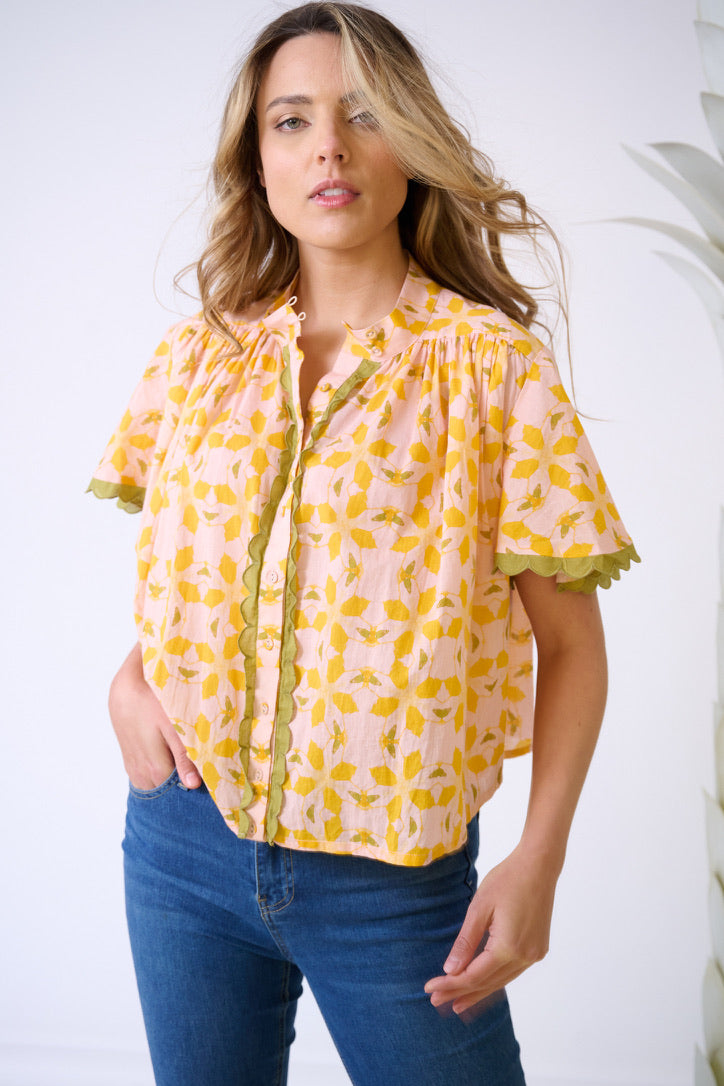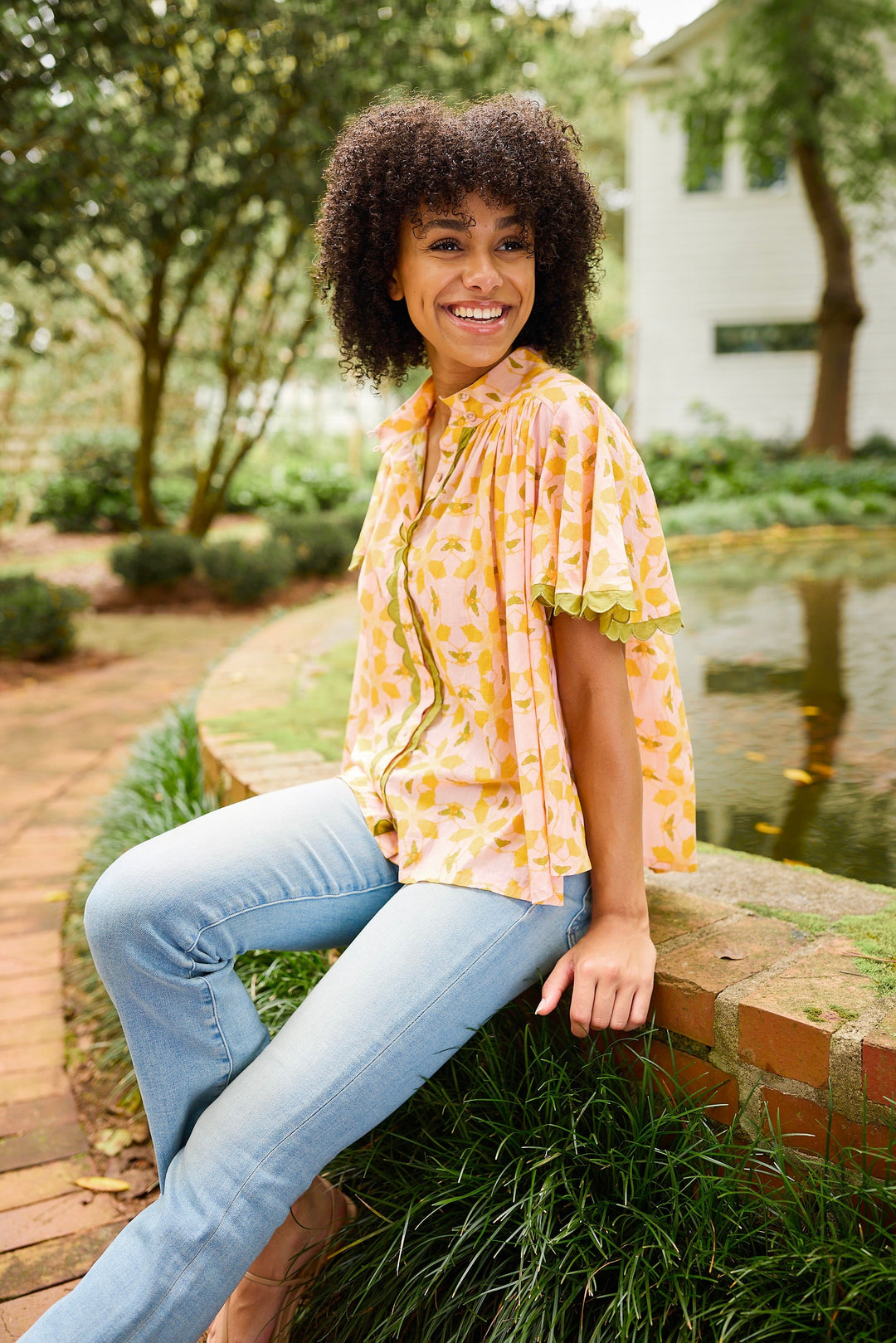 Meet our Parham Gathered Blouse. Crafted from a soft and light cotton voile, this blouse is an easy go-to from spring to fall. A delicate scalloped trim down the center front and on the sleeves adds a touch of contrast while pairing beautiful with our original Orange Azalea print. Gathering at the upper bust and back allow for a relaxed, flowy fit.