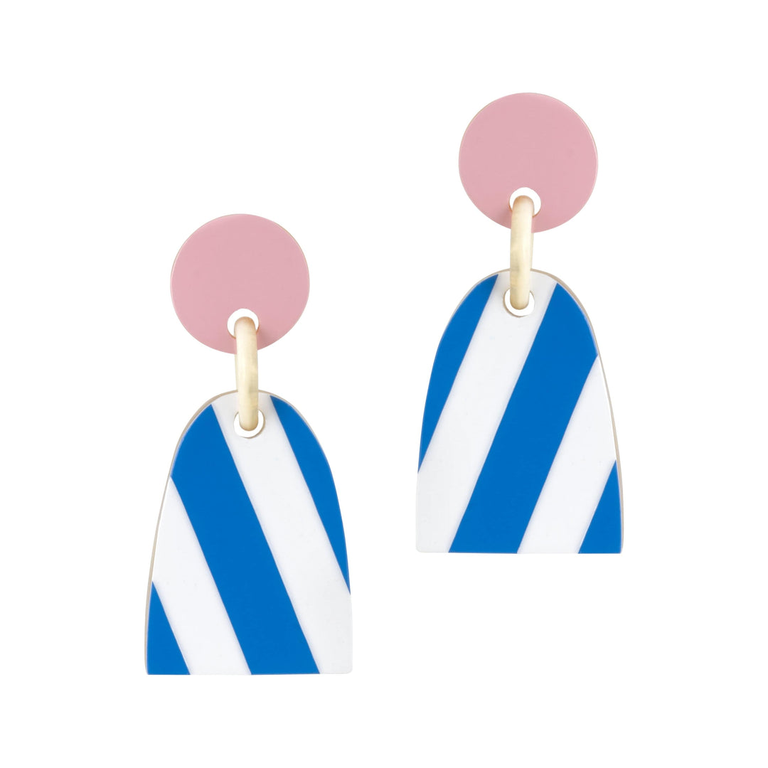 The Bermuda Arch Dangles feature bold blue and white stripes with a soft pink stud for a playful yet stylish look. Lightweight and eye-catching, these earrings are perfect for adding a nautical flair to your outfit.