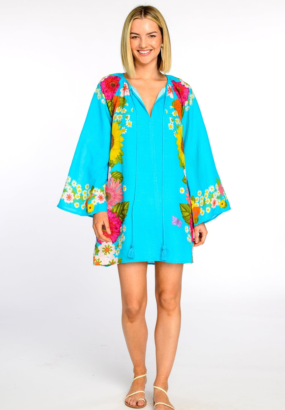 Effortless and easy to wear, our Chelsea Dress can be worn over a swimsuit during the day or dressed to the nines with your favorite heels. We love her dramatic bell sleeves & gathered V neckline, and she looks especially chic in this Wildflower Aqua print.