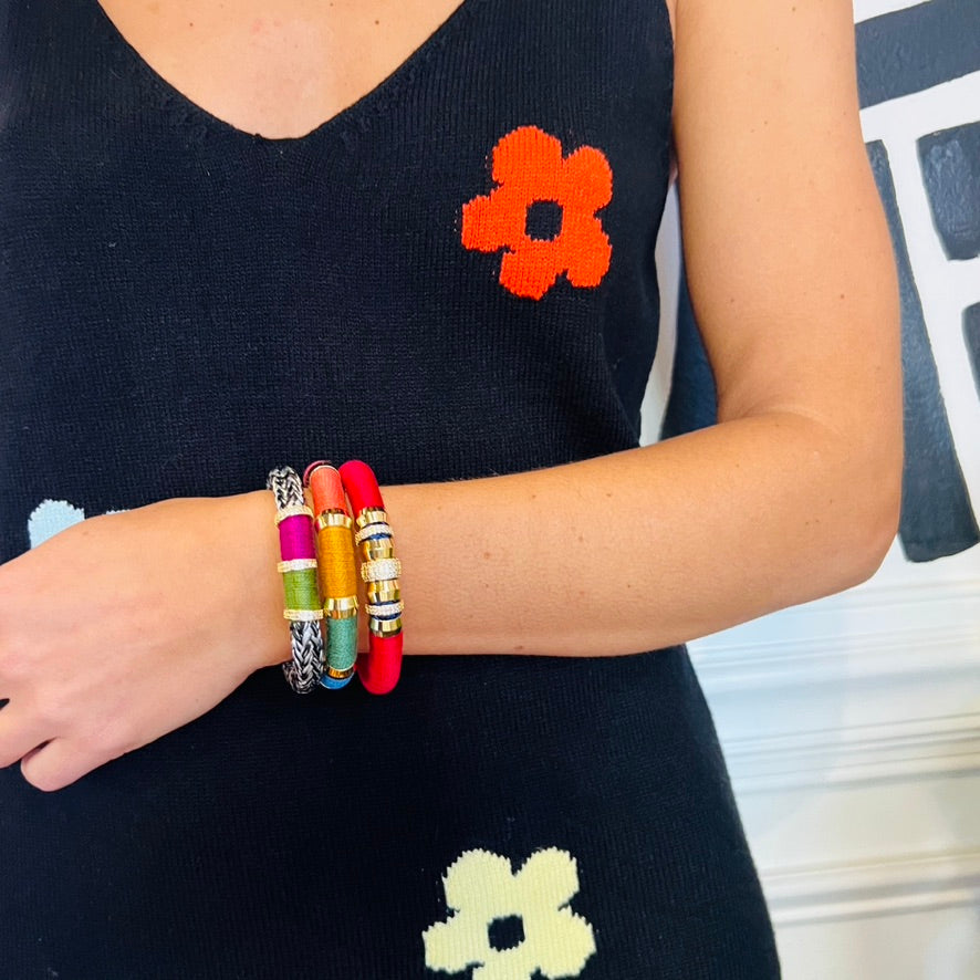 Make a statement with this fashionable Colorblock Bracelet . Gold plated ferrules make it the perfect accessory to pair with any outfit. You'll love the stylish color block best-selling design!