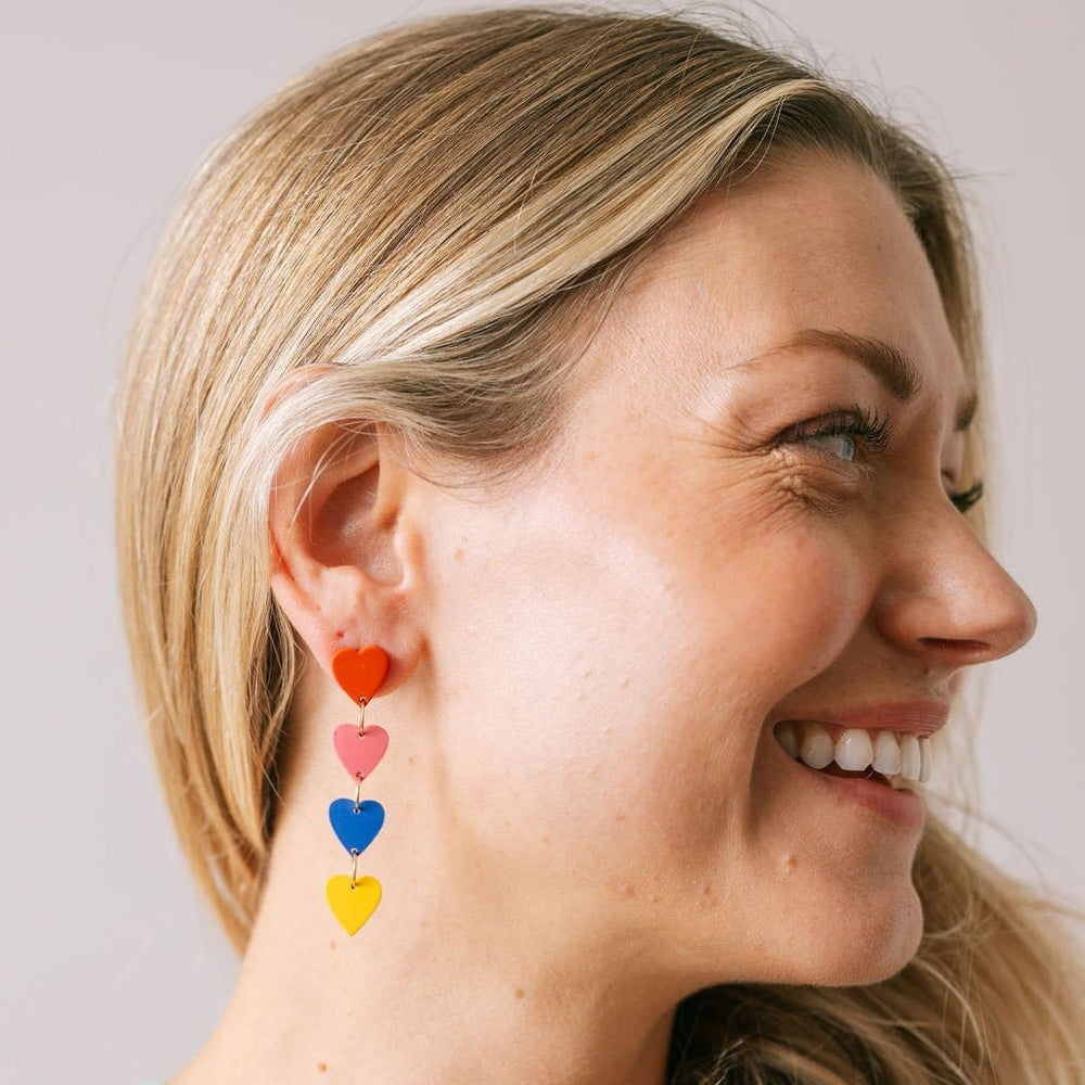 The Colorful Heart Dangles feature a playful cascade of vibrant hearts in orange, pink, blue, and yellow. These lightweight earrings add a fun and cheerful touch to any outfit.