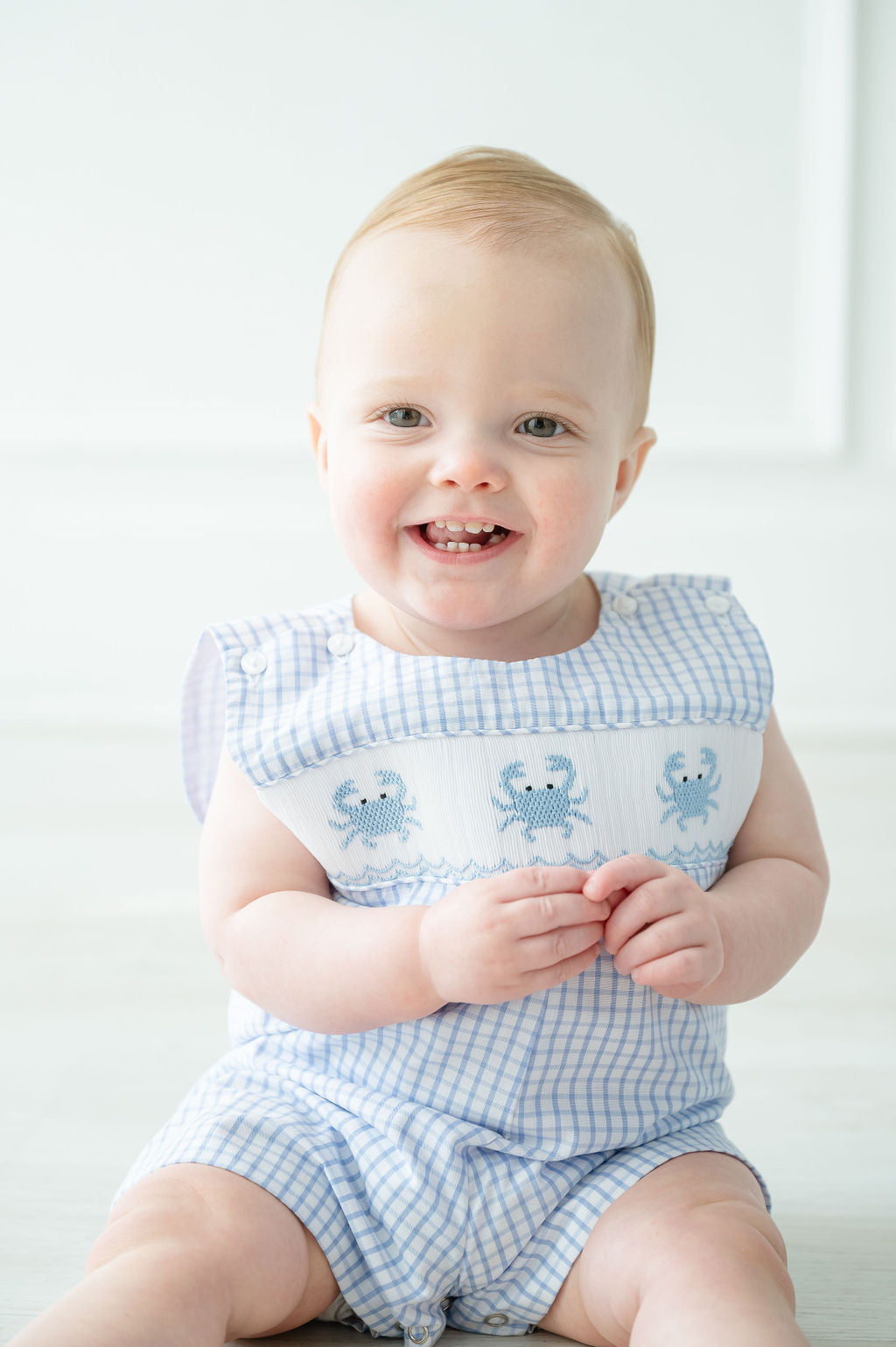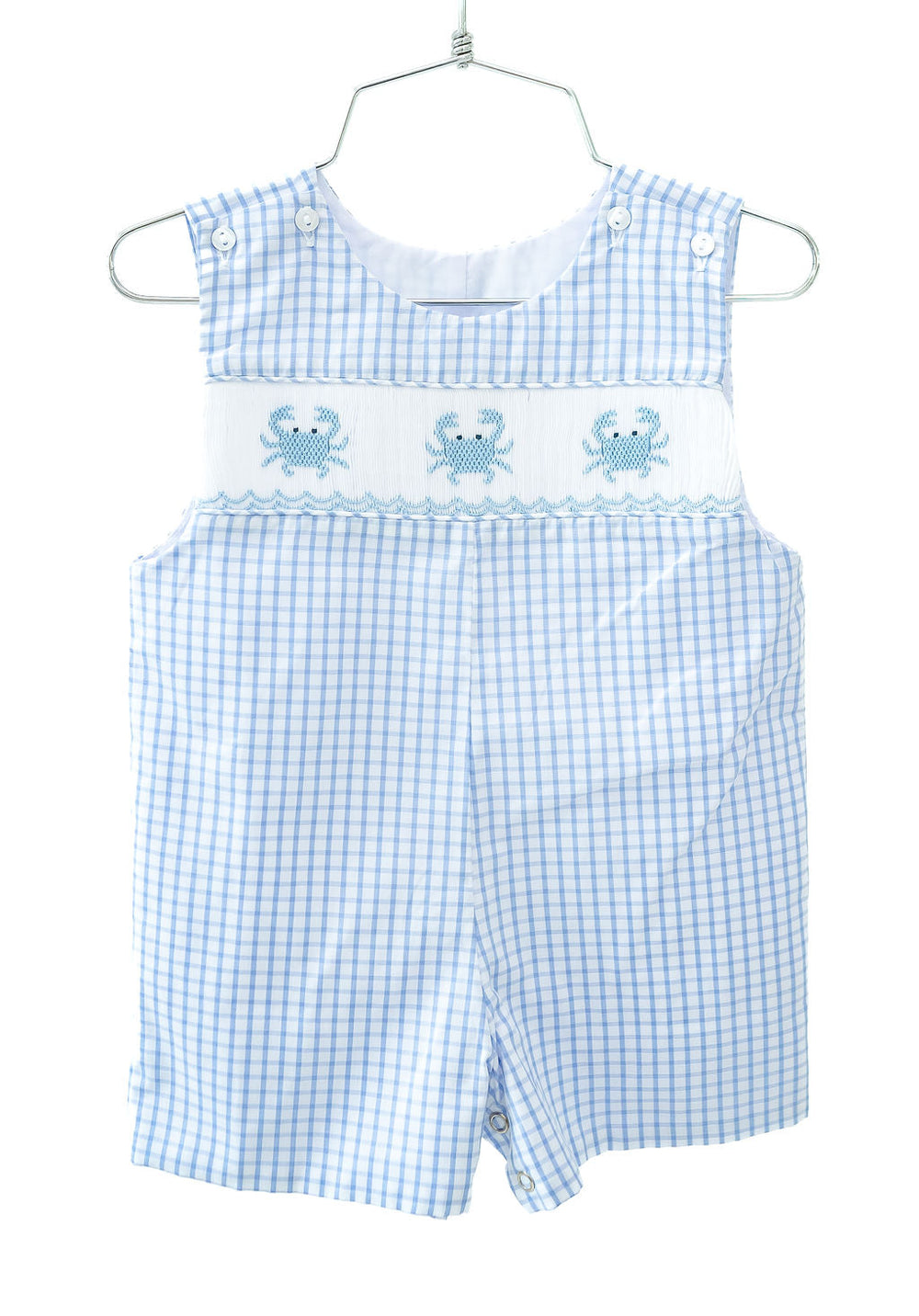 The Smocked Crab JonJon is a southern-inspired, heirloom-quality piece perfect for beach trips, summer vacations, and family gatherings. Featuring hand-smocked crabs in blue, this charming jonjon is made from soft light blue and white check fabric. Whether it’s a day at the beach or a family event, this jonjon is designed for both comfort and style. Available in sizes 3M to 4T, it’s a must-have for your little one’s summer wardrobe.