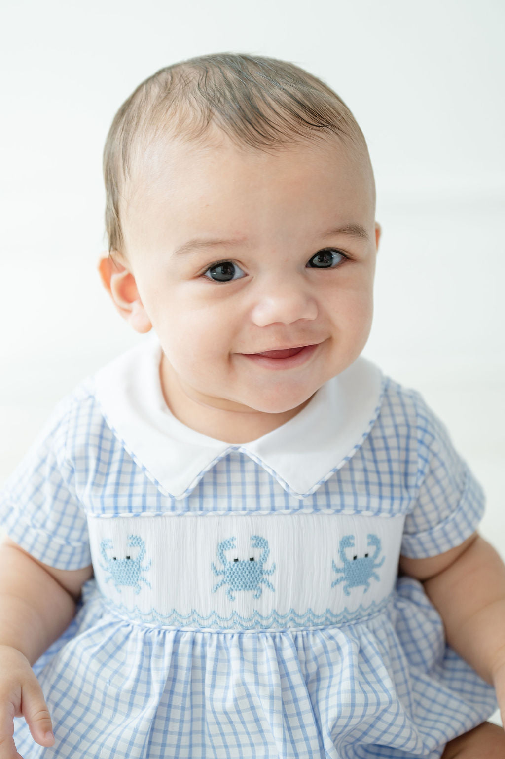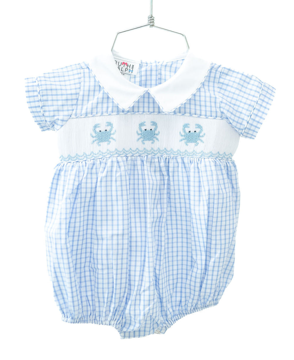 The Smocked Crab Bubble for baby and toddler boys is a charming, playful outfit featuring hand-smocked crabs in blue across the chest. The light blue and white check fabric gives it a timeless, southern-inspired look, perfect for beach trips and summer vacations. Crafted from a soft and breathable 65% polyester/35% cotton blend, this bubble offers both comfort and durability for your little one’s summer adventures. Available in sizes NB to 3T, it combines heirloom-quality craftsmanship with fun, playful style.