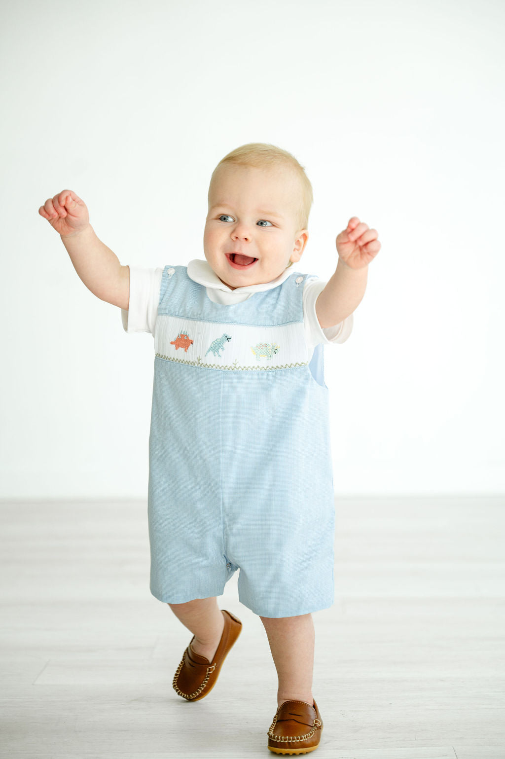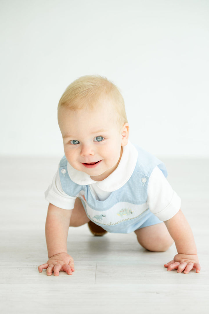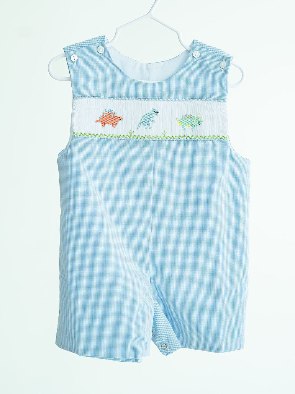- Hand smocked dinosaurs on jon jon one piece romper shortall