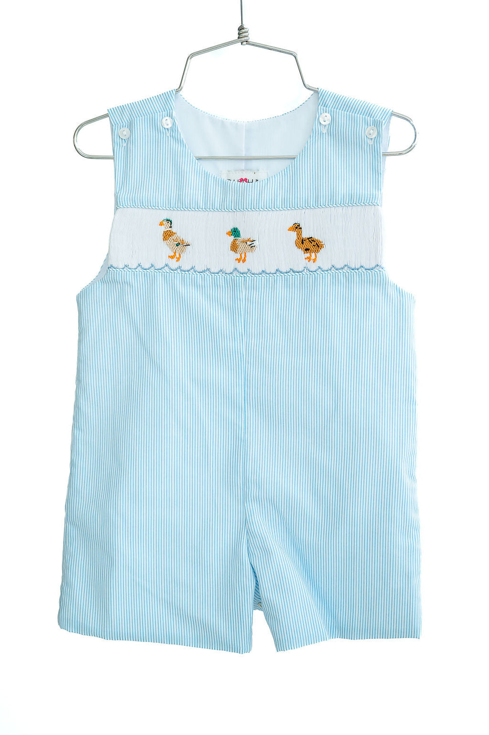 The Smocked Ducks JonJon features adorable hand-smocked ducks, perfect for spring and fun celebrations. The jonjon is crafted from a soft thin blue stripe fabric, made with a blend of 65% polyester/35% cotton for comfort and durability. Ideal for Easter celebrations and special occasions, it’s available in sizes 3M to 4T. Add a Peter Pan collar shirt for a classic, heirloom-quality look that embodies Southern charm and timeless style.