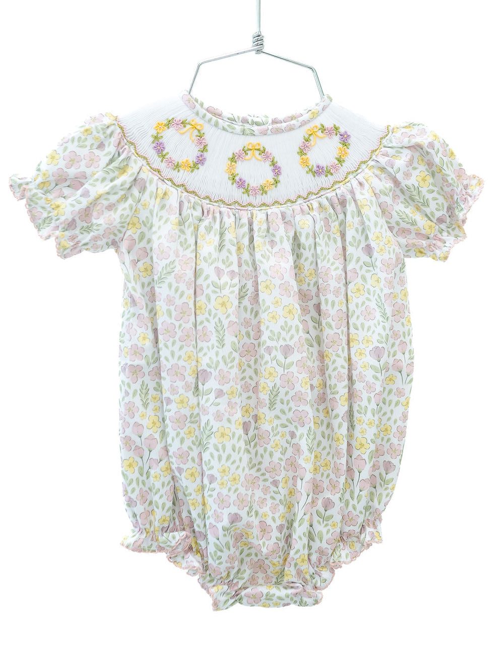 The Smocked Floral Wreath Bubble features hand-smocked floral wreaths in purple, pink, and yellow, set against a soft lavender floral print fabric. Ideal for springtime celebrations, Easter, flower photoshoots, and Mother’s Day, this heirloom-quality bubble offers timeless style. Available in sizes 3M to 2T, it’s the perfect choice for your little one’s wardrobe.
