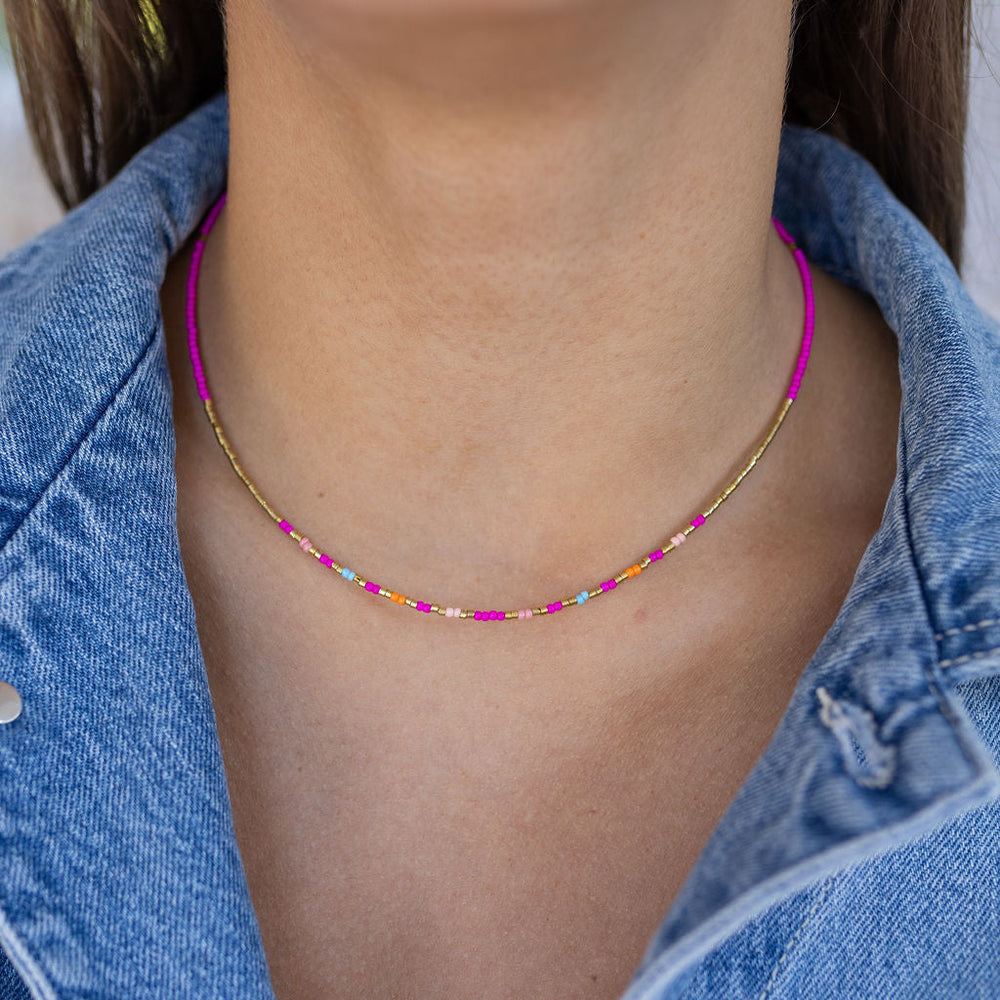 Nothing’s better than adding some color and texture to your look especially when there are so many bright color options! Layer this gorgeous pink, gold, and turquoise beaded necklace with your other favorites. The styling possibilities are truly endless.