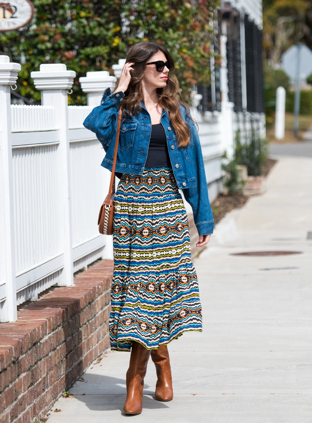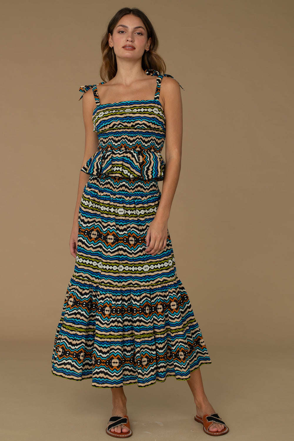 An EJ classic, the Izzy Skirt Dress. Combining contemporary with comfort, the Izzy features tiered seams and a smocked waistband. This skirt drapes beautifully and offers effortless movement. The tiered seams add dimension to the skirt, creating a flattering A-line silhouette that gently flares from the waist to the hem. The tiers ruffle down the length of the skirt, providing a romantic and feminine touch. A smocked waistband ensures a comfortable and flexible fit through the hips. The elasticized smocking not only adds texture to the waistband but also allows for easy wearing. Whether worn high on the waist, lower on the hips, or as a strapless mid-length dress, the smocked waistband provides versatility. With its full-length design, the Izzy can be dressed up or down for various occasions. Pair it with one of our blouses and heels for a sophisticated evening look, or style it with sandals for a relaxed daytime ensemble.