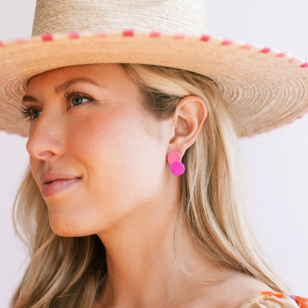 The Mini Hibiscus Double Circle Studs feature a playful combination of pink and magenta in a sleek double-circle design. These lightweight mini studs are perfect for adding a pop of color to your everyday look.