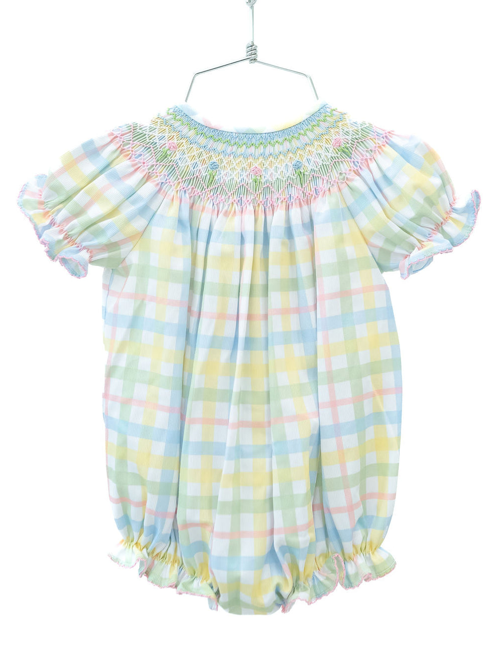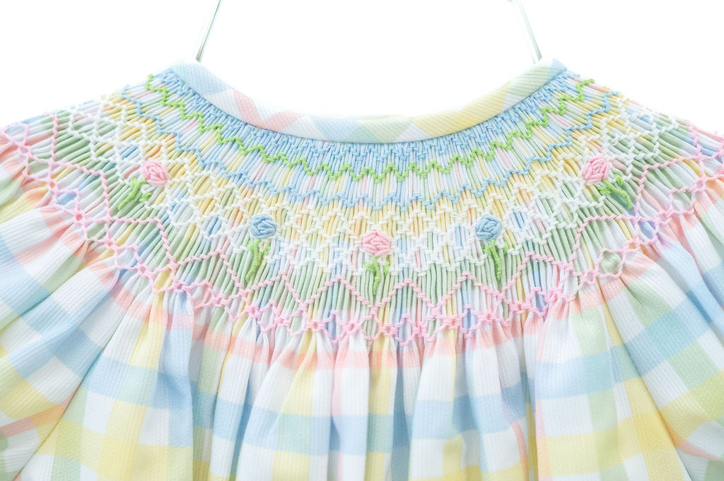 The Pastel Smocked Easter Plaid Bubble for baby and toddler girls features exquisite hand-smocked flowers and geometric patterns, showcasing heirloom craftsmanship. Made from a soft, durable blend of 65% polyester and 35% cotton, this bubble provides all-day comfort while maintaining its timeless quality. Perfect for Easter, spring celebrations, and special occasions, it’s available in sizes 3M to 2T.