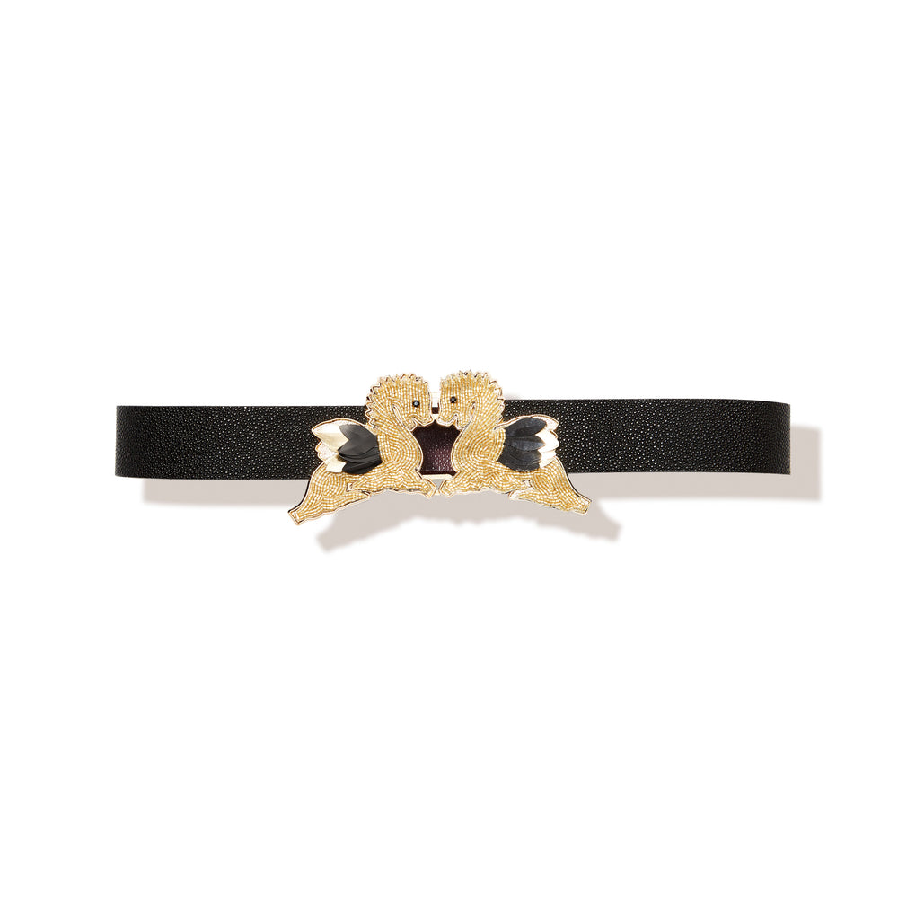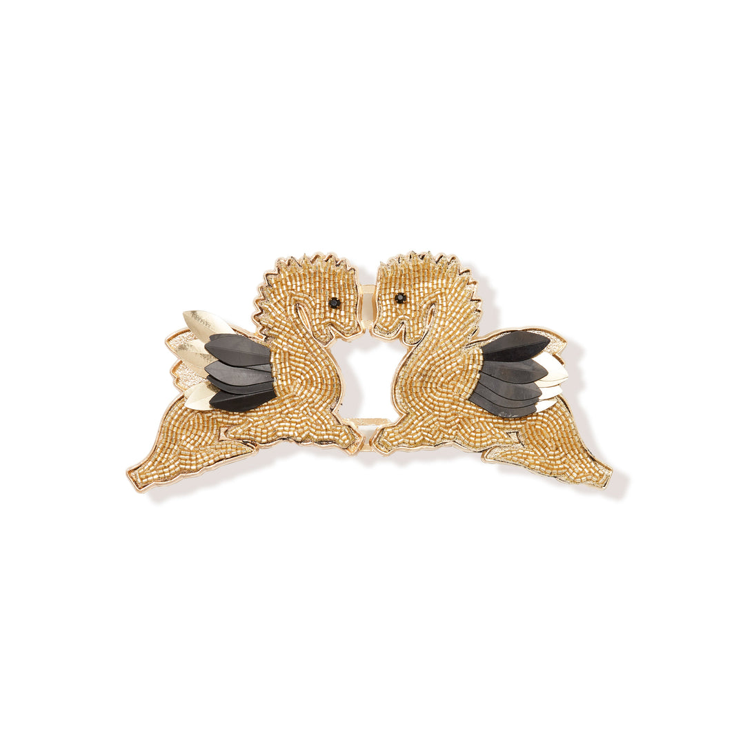 Not appropriate for climbing Mount Olympus, but still throws lightening when paired with denim and your favorite tee, an evening gown, or a cocktail dress. Hand-cut sequin wings with Czech tube beads and semi-precious jeweled eyes. Crafted in India and finished with Interlocking gold-plated hardware.