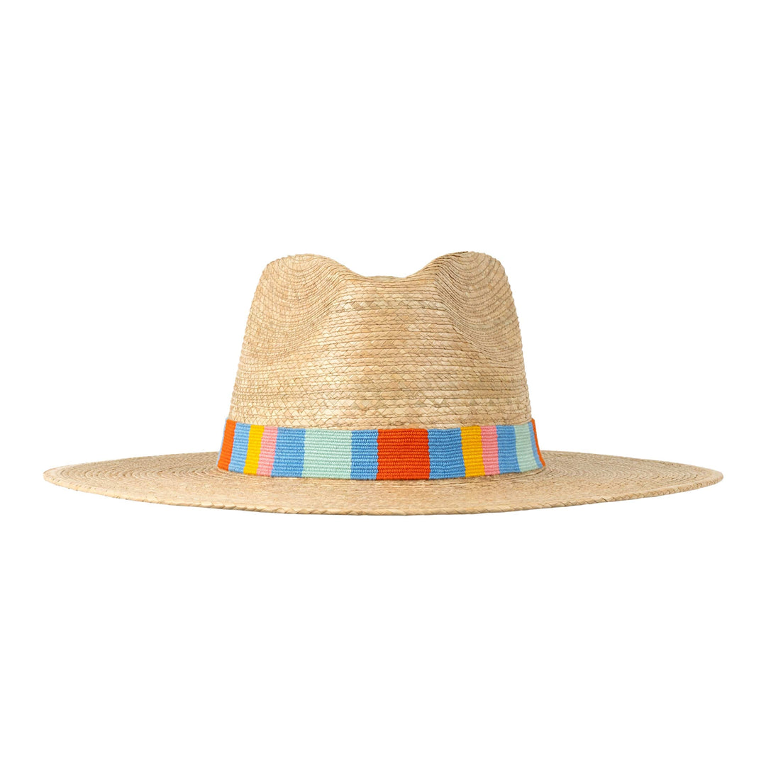 The Best Selling Reyna Palm Hat features a cotton band with blue, turquoise, red, yellow and pink stripes and is a part of our sustainable, fair trade hat collection and rated UPF 50+, the highest possible UV protection.