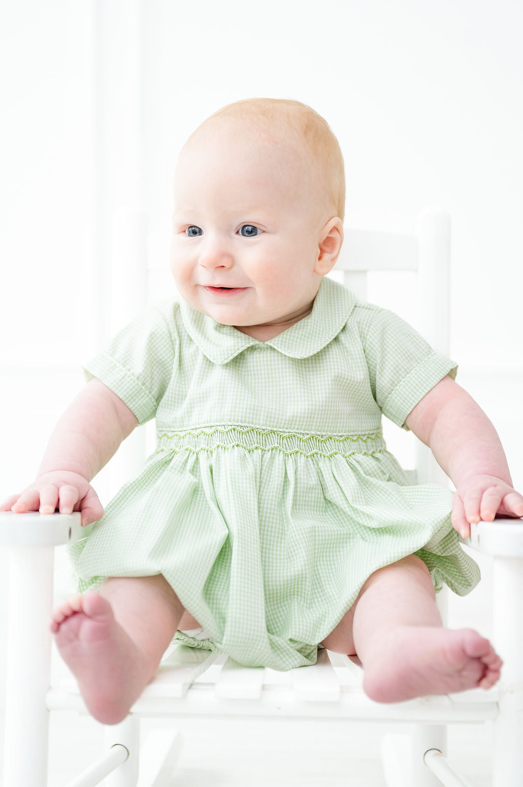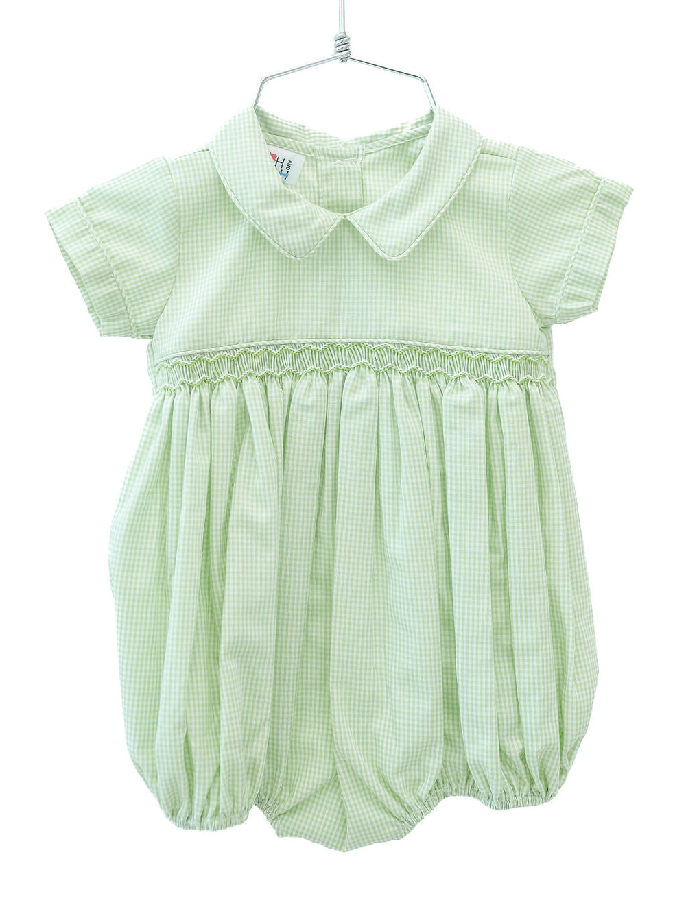 The Smocked Sage Green Gingham Bubble for babies and toddler boys features simple green smocking across the chest and a classic gingham fabric with a collar. Made from a 65% polyester/35% cotton blend, it’s perfect for Easter and spring events. Available in sizes NB to 2T, with heirloom-quality design.
