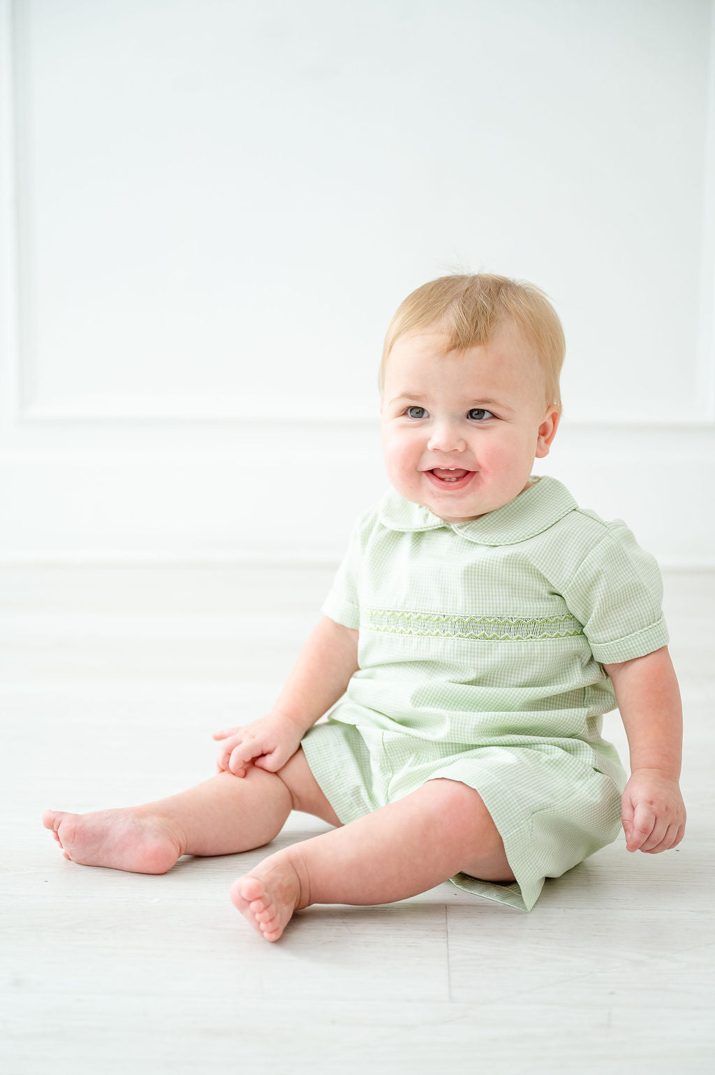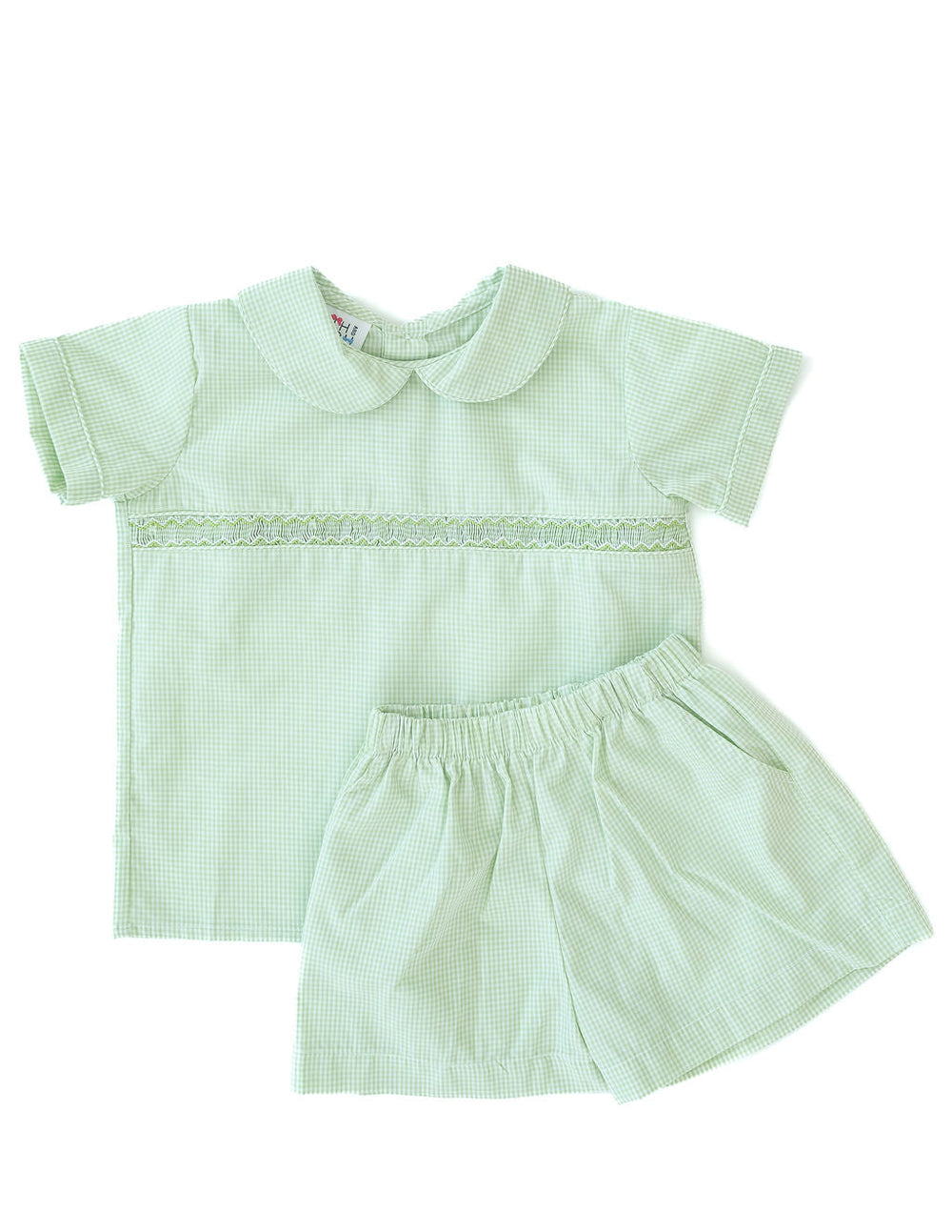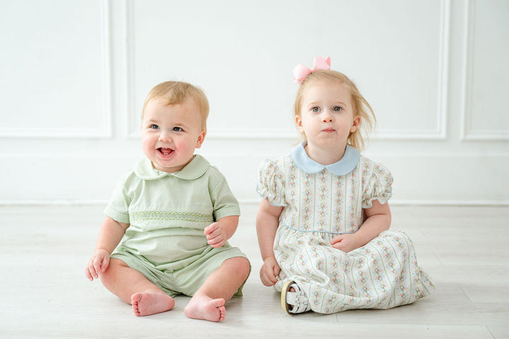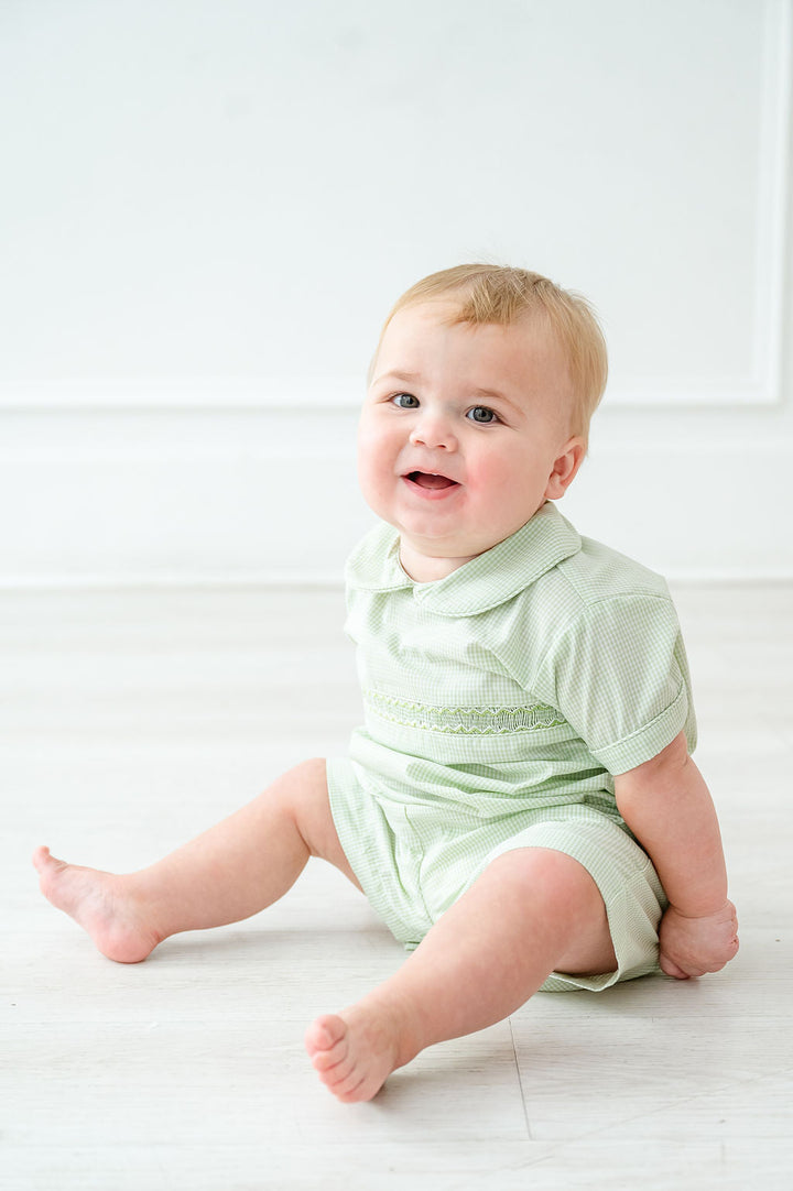 The Sage Green Gingham Shirt and Short Set features simple green smocking across the chest, offering a timeless and polished look. Made from classic green gingham fabric, it’s perfect for spring, Easter, and special family events. The hand-smocked detailing and crisp collar add a classic touch, while the 65% polyester/35% cotton blend ensures comfort and durability. Available in sizes 12M to 8.