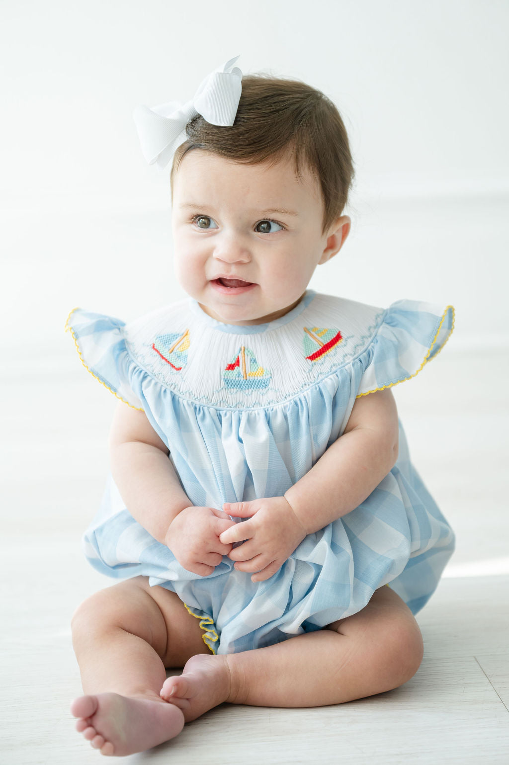 - Hand-smocked sailboats in teal, light blue, yellow, and red