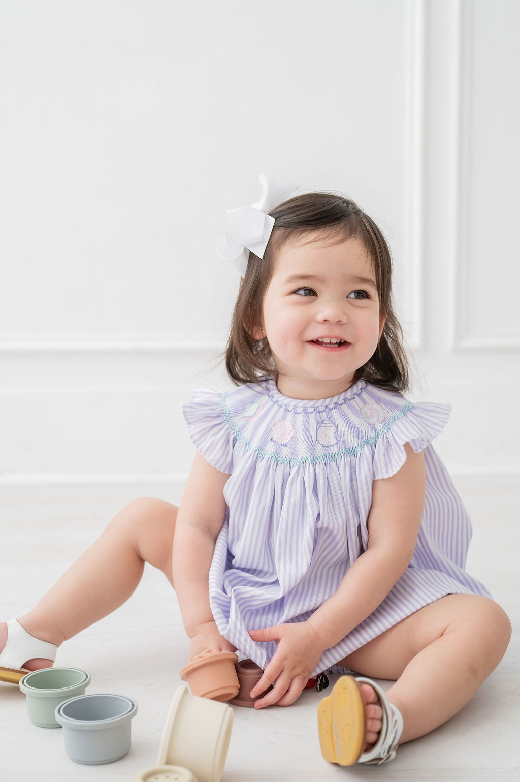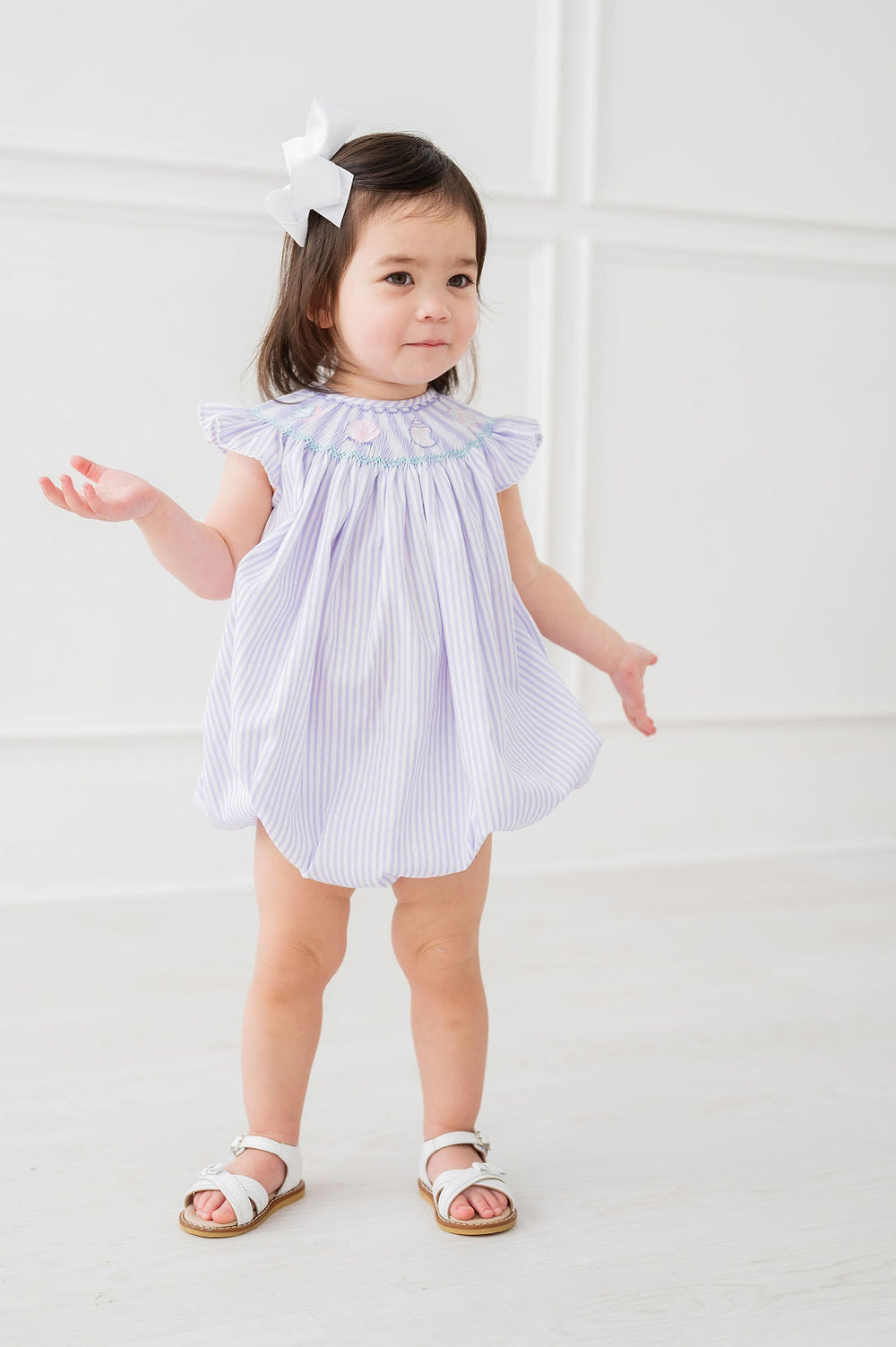 The Smocked Seashells Bubble features hand-smocked seashells in light blue, teal, and pink, beautifully showcased on soft lavender striped fabric. Perfect for beach trips, summer family events, or southern-style gatherings, this heirloom-quality bubble combines charm with comfort. Made from a soft 65% polyester/35% cotton blend, it’s designed for lasting wear and all-day comfort. Available in sizes 3M to 2T for baby and toddler girls, it’s an ideal choice for sunny adventures and special occasions.