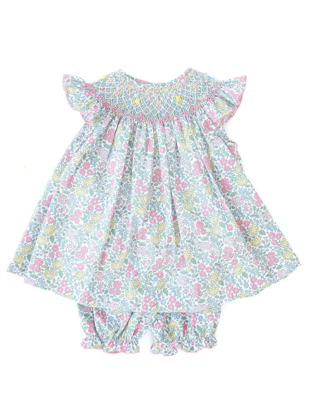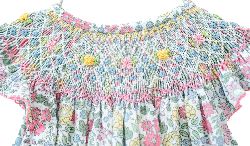 The Smocked Floral Garden Bloomer Set brings the beauty of spring and summer to life with its hand-smocked small flowers in shades of pink, yellow, green, and blue. The soft floral print fabric paired with matching bloomer shorts creates a coordinated and charming look perfect for seasonal events. Whether it's a Mother's Day celebration, a tea party, or a sunny day out, this heirloom-quality set offers both style and comfort. Made from a soft 65% polyester/35% cotton blend, it's designed for durability and all-day wear. Available in sizes 3M to 4T, this set is a must-have for your little one's wardrobe.
