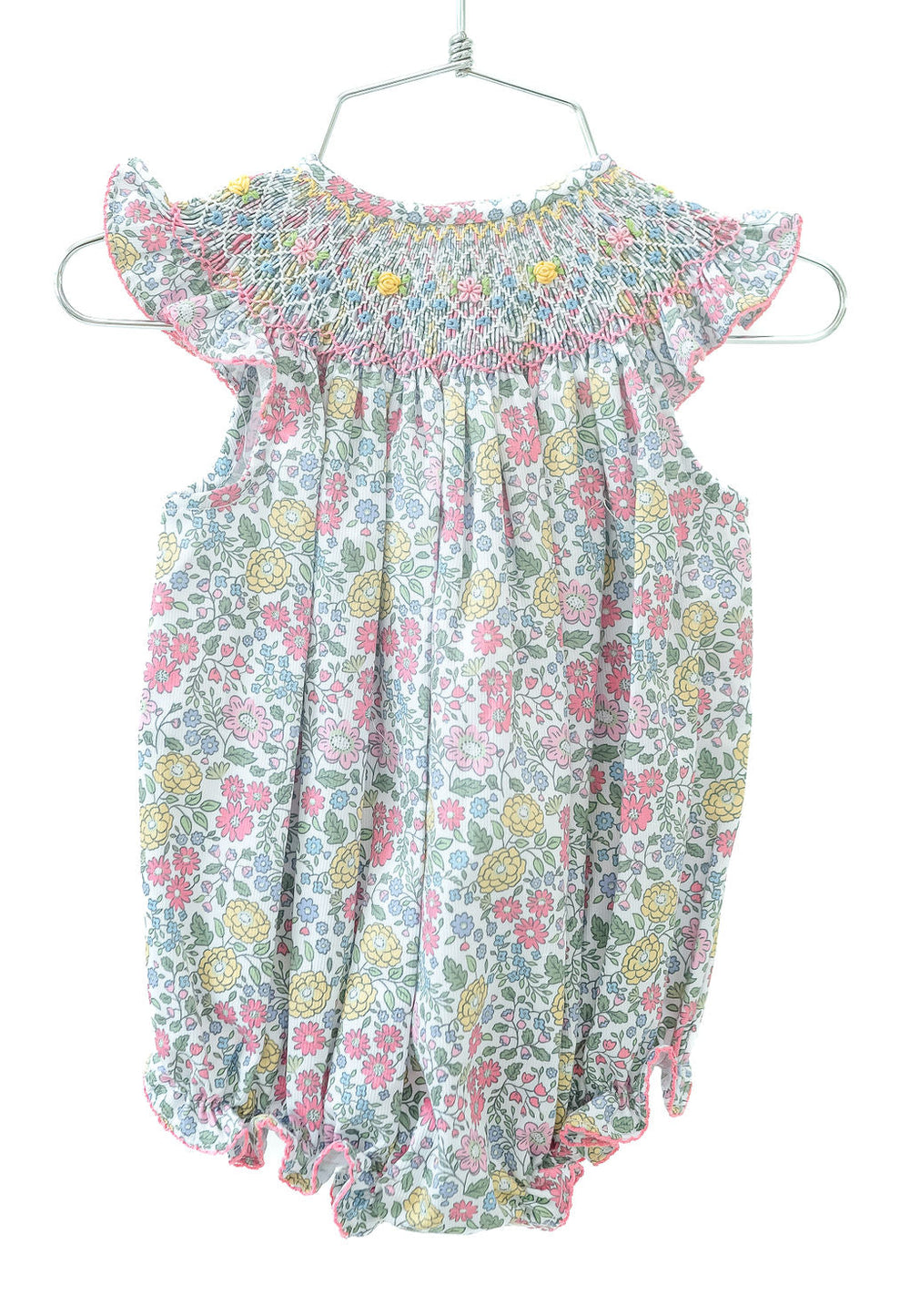 The Smocked Floral Garden Bubble is the perfect blend of charm and elegance for your little one’s spring and summer wardrobe. Featuring hand-smocked small flowers in shades of pink, yellow, green, and blue, this heirloom-quality bubble is crafted from a soft floral print fabric that captures the essence of warm-weather fun. Ideal for tea parties, special events, or family gatherings, it offers both comfort and style. Available in sizes 3M to 2T, this timeless piece is designed to create lasting memories for your little girl.
