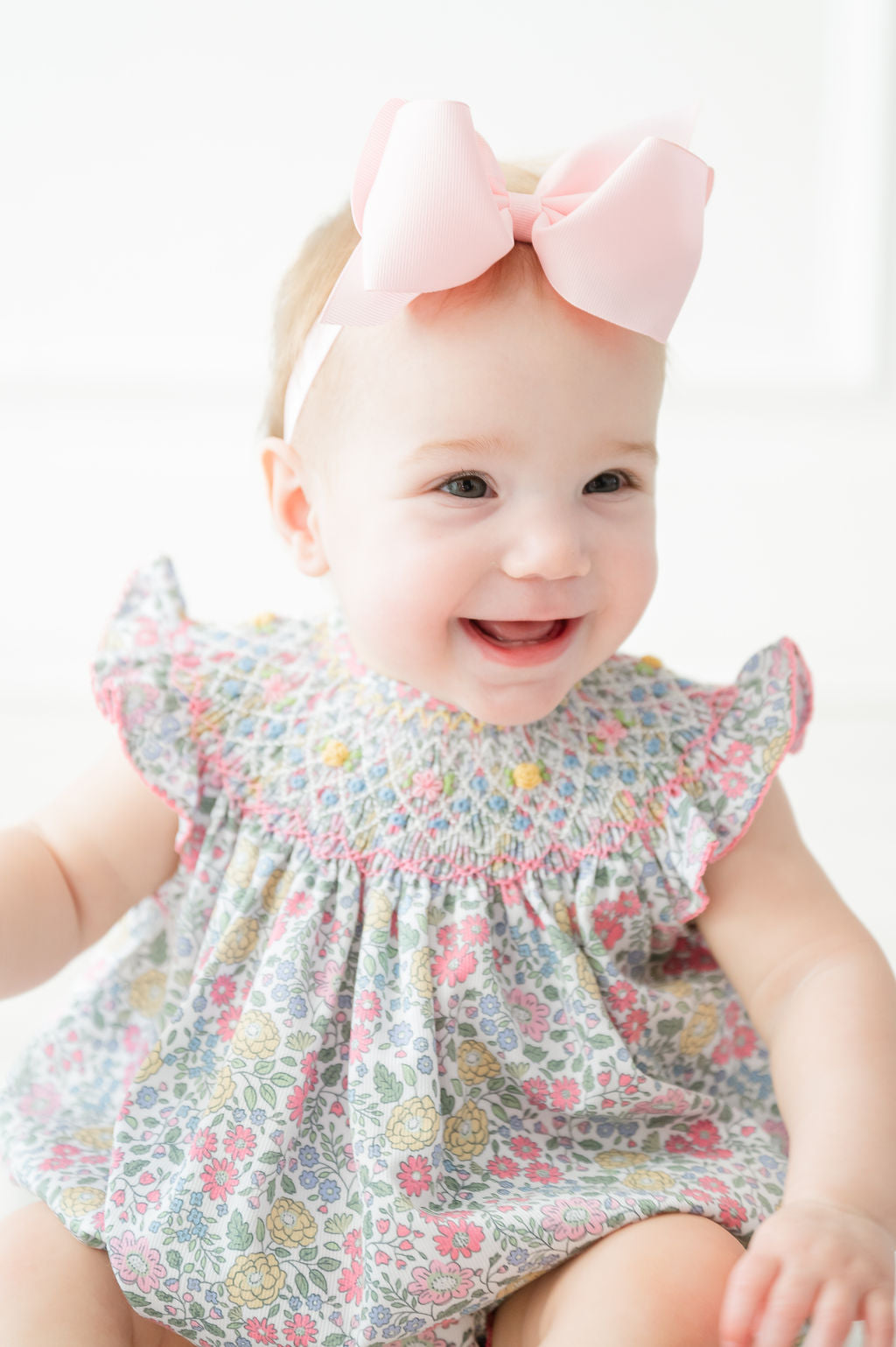 - Hand-smocked small flowers in pink, yellow, green, and blue