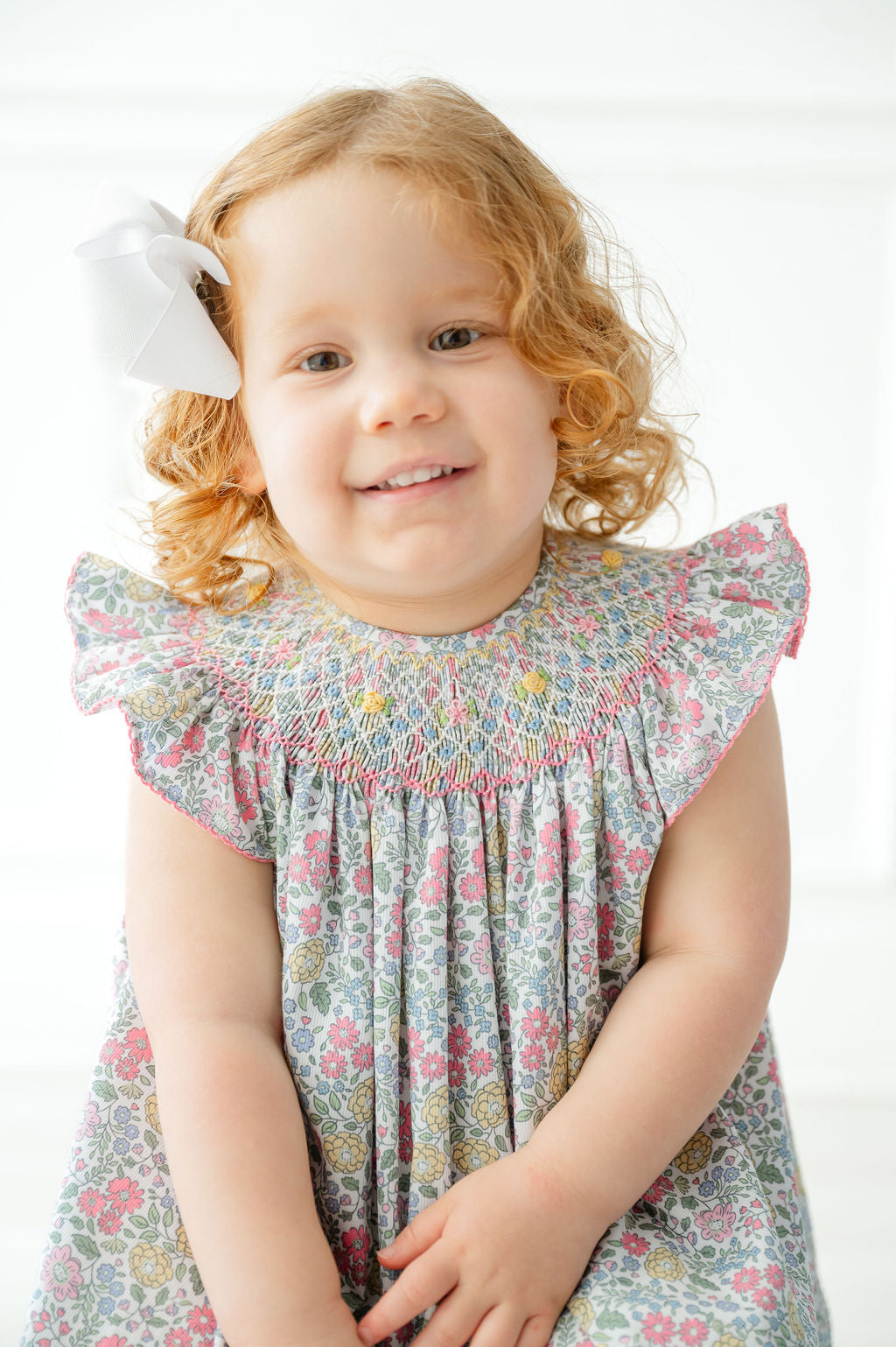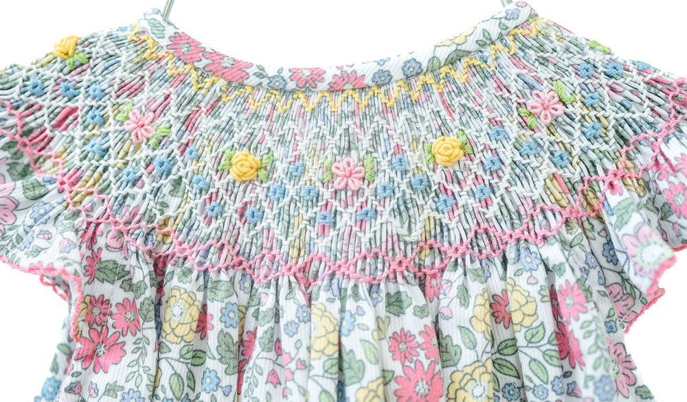 - Hand-smocked small flowers in pink, yellow, green, and blue