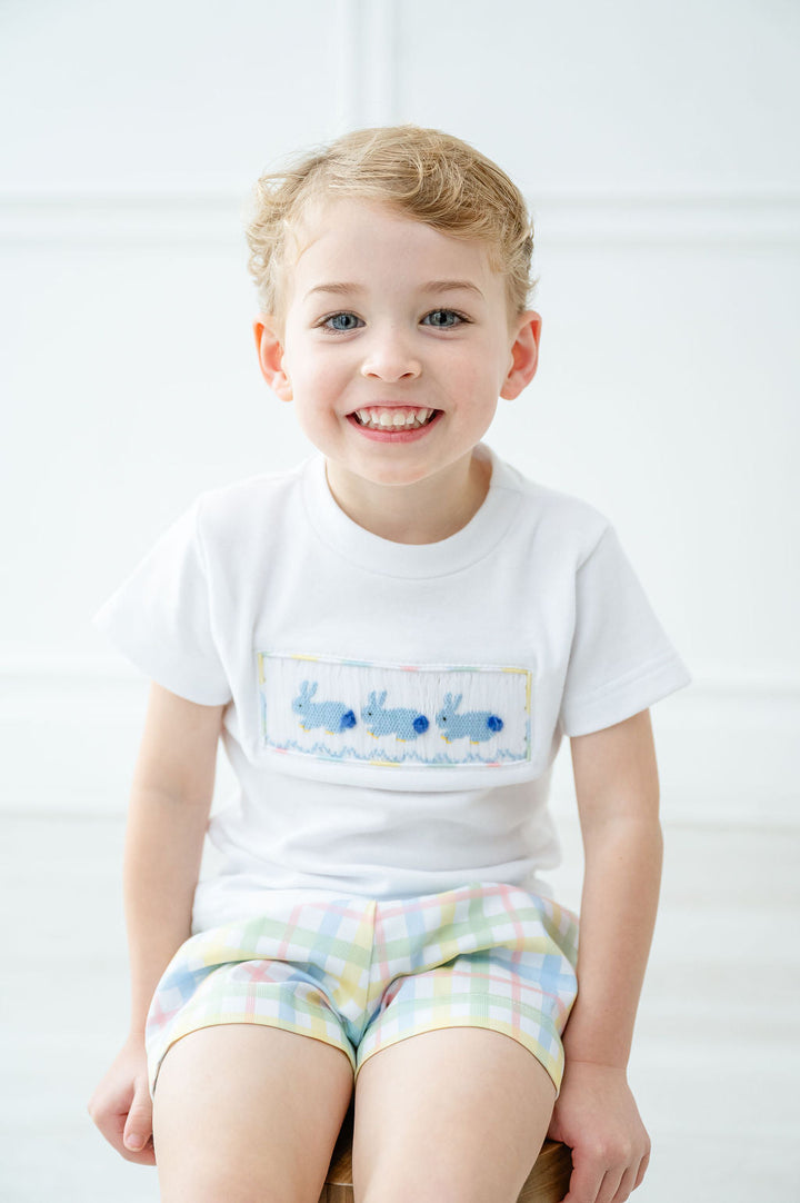 The Smocked Easter Bunnies T-Shirt and Short Set is a classic and traditional outfit, perfect for Easter celebrations. The shirt features hand-smocked blue bunnies with cotton tails. Paired with pastel plaid fabric shorts, this set offers a timeless, playful look. Available in sizes 12M to 8.