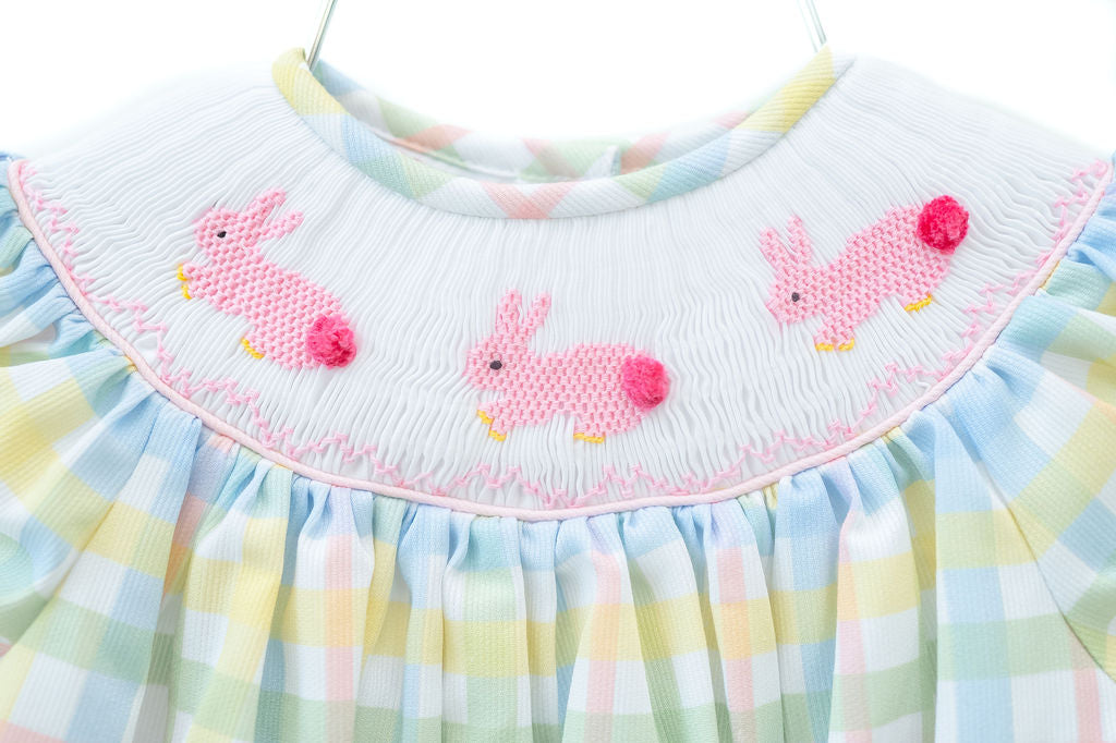 - Hand-smocked pink bunnies with cotton tails for a charming, traditional design