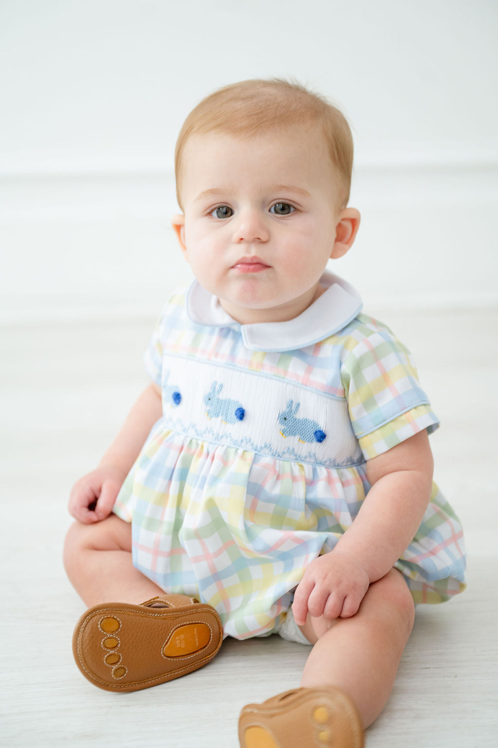 The Smocked Easter Bunnies Bubble for baby and toddler boys is a charming, traditional piece perfect for Easter celebrations. The bubble features hand-smocked blue bunnies with cotton tails on a pastel plaid fabric. Crafted from a soft blend of 65% polyester and 35% cotton, your little one will be comfortable all day long. Available in sizes NB to 3T.