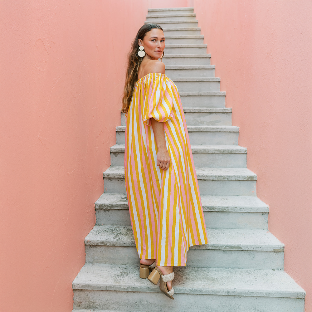 The Sunkissed Stripe Ace Dress features vibrant yellow, pink, and white stripes that evoke a carefree summer vibe. With its puff sleeves and option to wear off the shoulder, this flowy silhouette is perfect for sunny days and relaxed outings.