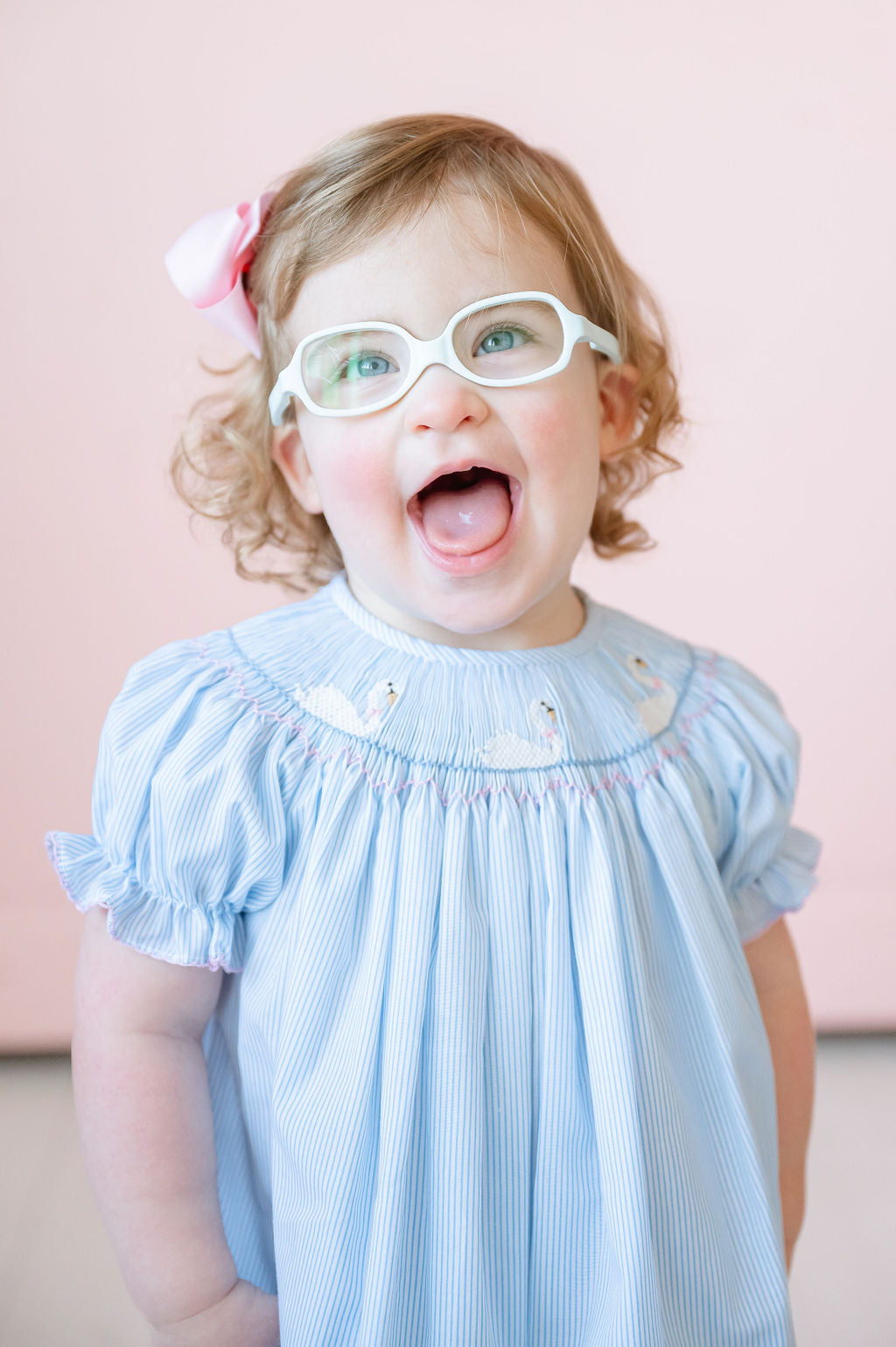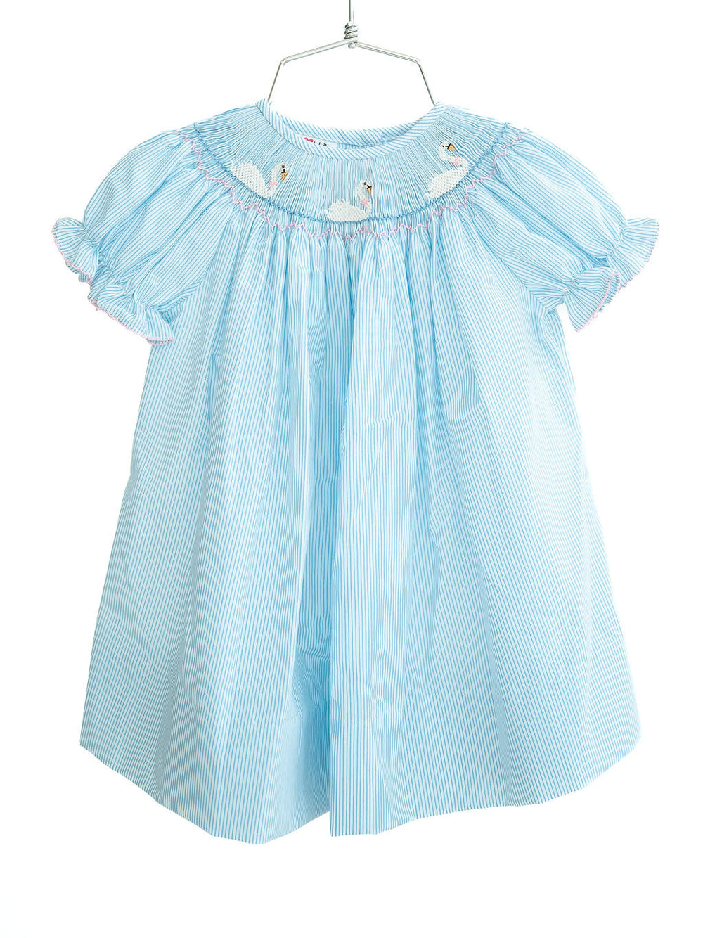 - Hand-smocked swans with pink bows
