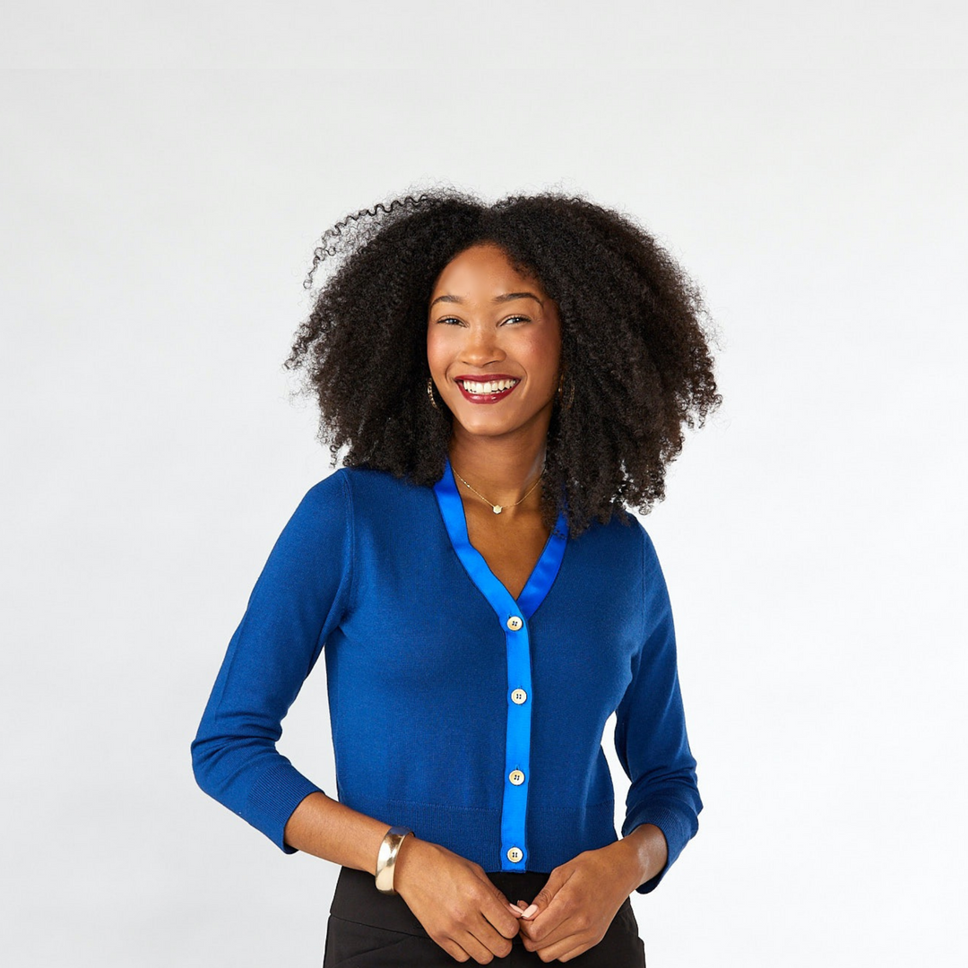 Channel your inner Parisian with our refined cropped cardigan made of 100% fine gauge merino wool, featuring a placket lined with contrast grosgrain ribbon and gold buttons. We love merino wool because it is a lightweight knit worn year-round and it feels like butter. Maxwell & Geraldine's merino doesn’t itch or pill and keeps its shape beautifully. Throw on the Chloe by itself with a killer pair of jeans or use it as the perfect outfit polish. Beauty is in the details and this cardigan has you covered.