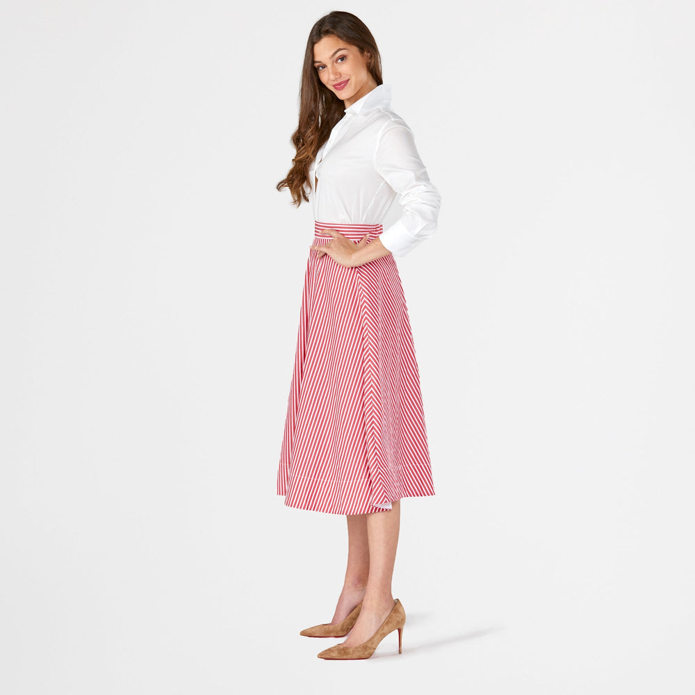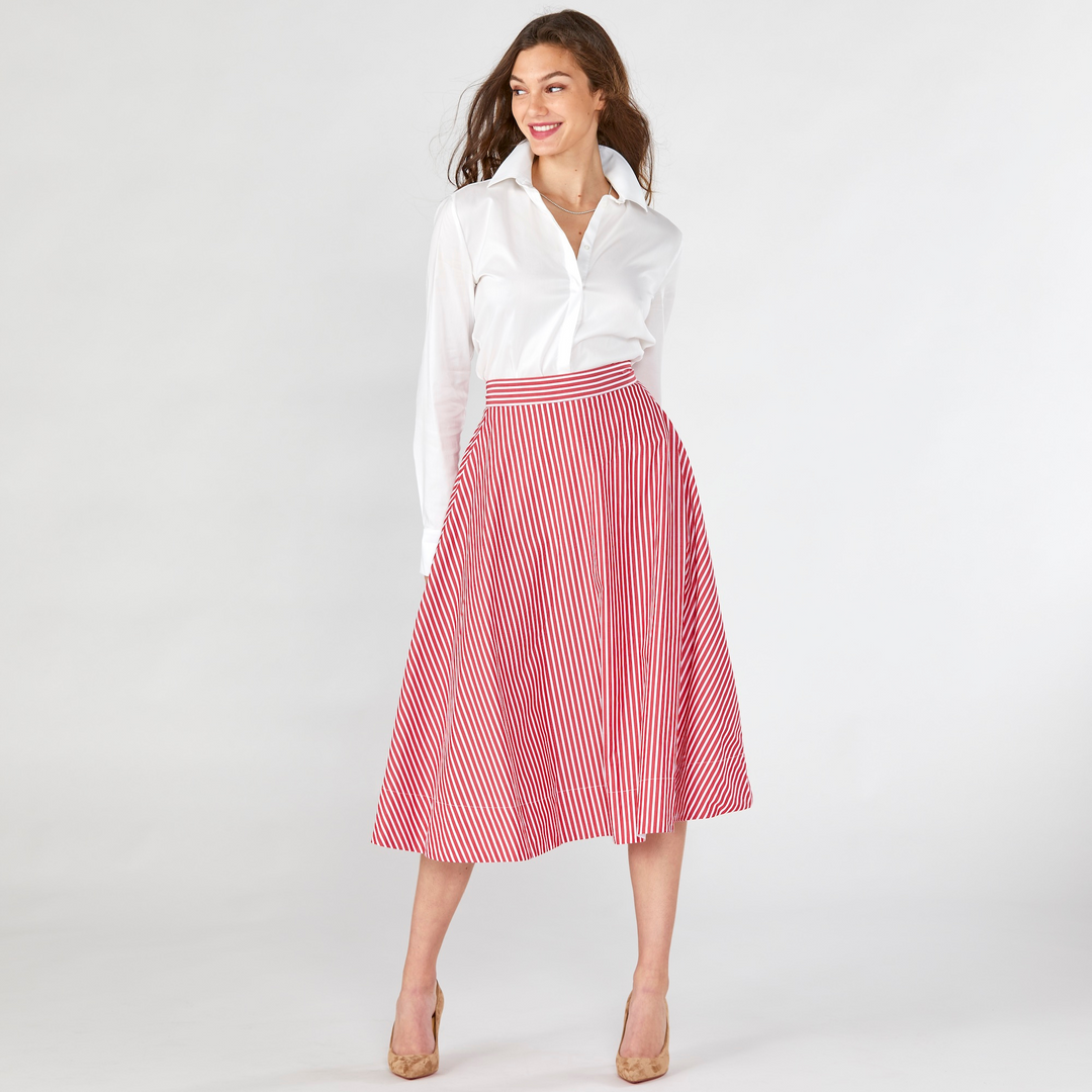 Make a statement in the perfect holiday skirt for all your seasonal events: office and holiday parties, dinners and cocktail parties, school events, and everything in between. Ginger’s secret weapon is a subtle elastic waist in the back that easily accommodates the most decadent party spreads. The vertical lines lengthen the body on a skirt that is just begging for a twirl on the dance floor. Wear it with a bodysuit to define the waist, a button down for a classic look, or with a fluffy sweater to party in absolute comfort.