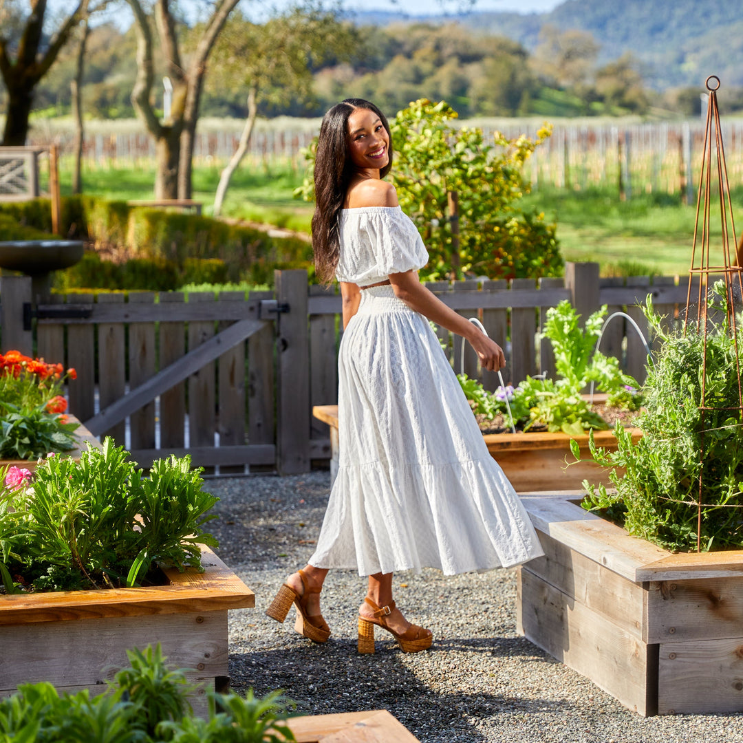 This eyelet maxi skirt is a breezy neutral for your spring/summer wardrobe. The skirt is unlined, but the cotton weight paired with subtle gathering makes it wearable without a slip. You will see a slight body outline in certain light. It is easily paired with a slip, boy shorts, or the undergarment of your choice for a more modest look. Pair it with Maxwell & Geraldine's Lauren Top for a coordinated look, or with the top of your choice.