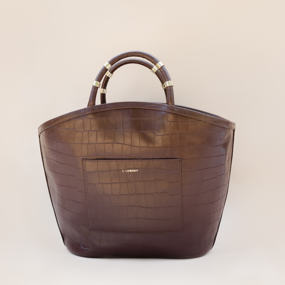 Made from croc embossed calf leather in Espresso Chocolate Brown. Lined with cotton twill fabric