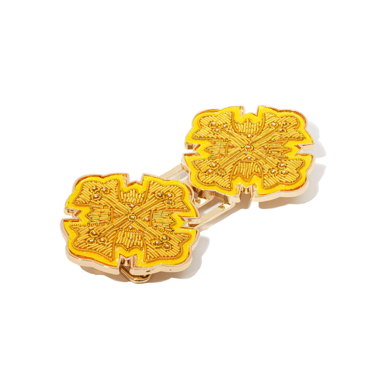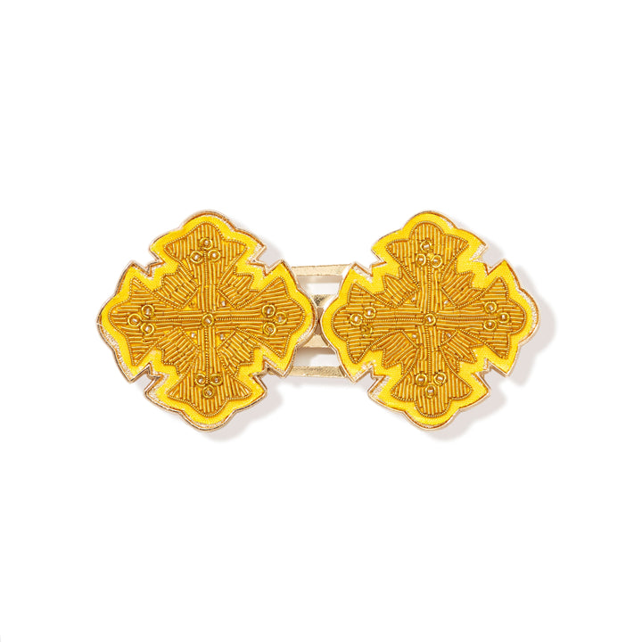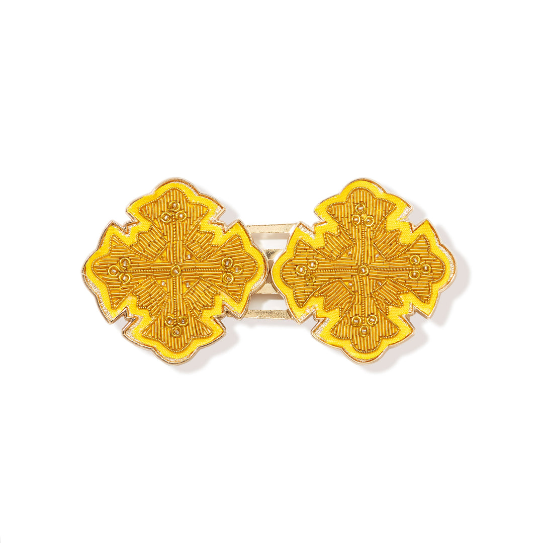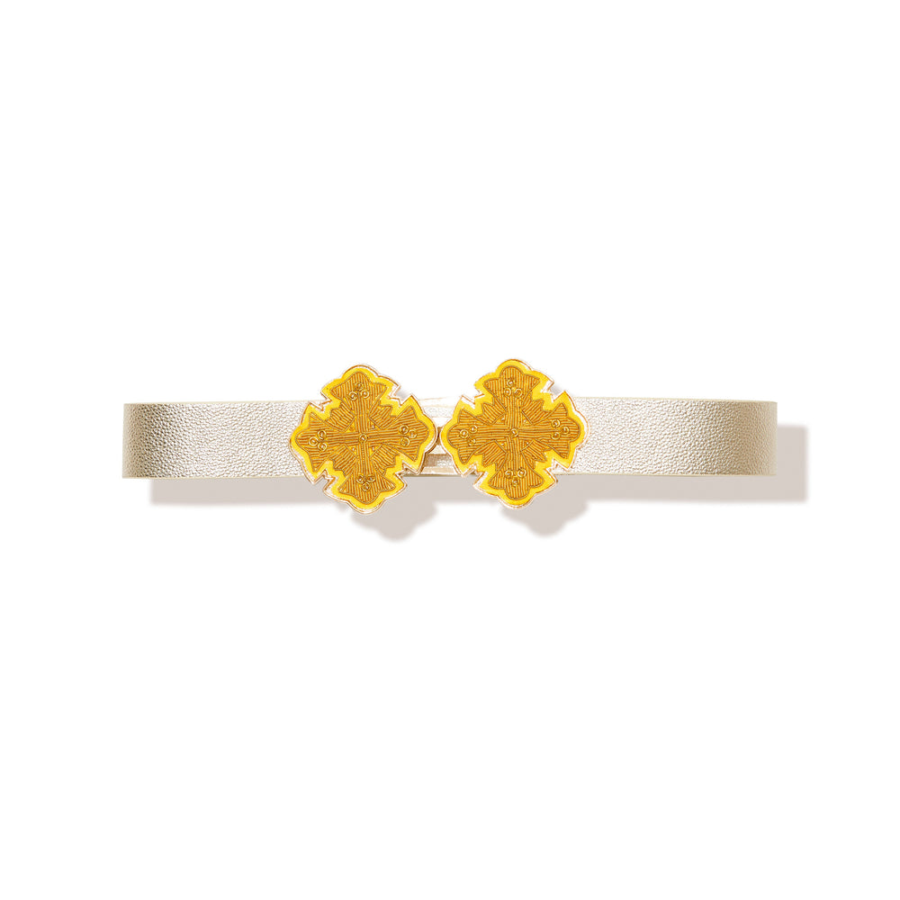 Intricate detail meets modern flair with our Yellow Cross belt. The distinctive buckle boasts two hand-beaded and embroidered gold crosses, creating a sophisticated and unique accessory that adds a touch of artistry to any outfit.